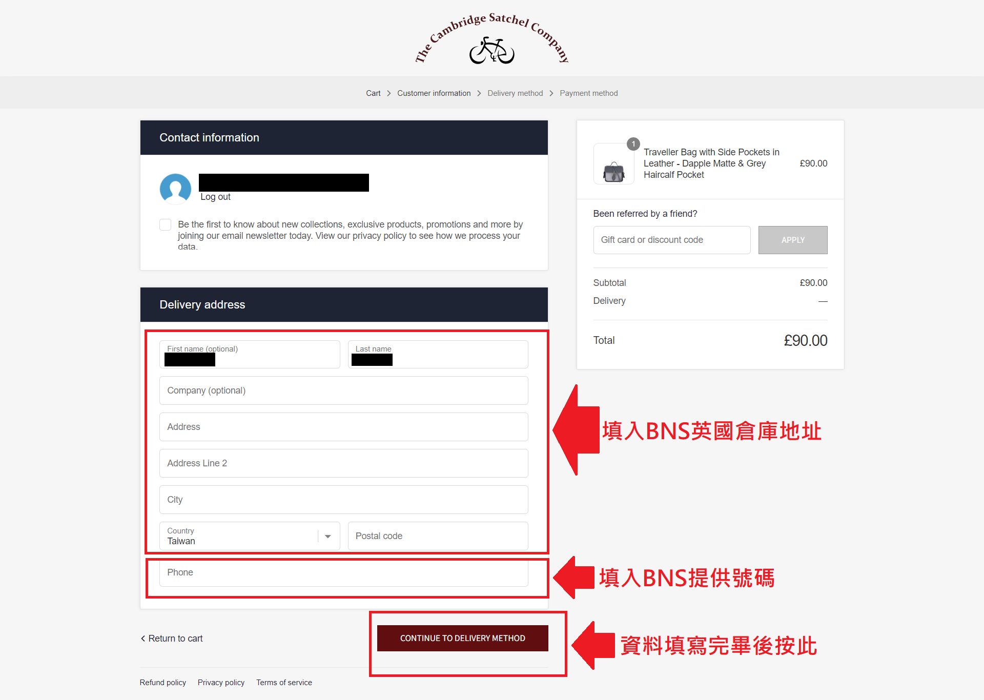 STEP 6.按照Buyandship網站中給的資料填寫空格(如下圖),記得名字要用羅馬拼音且依照Buyandship提供的模式填寫,然後按下Continue to delivery method,然後再按下Continue to payment method。