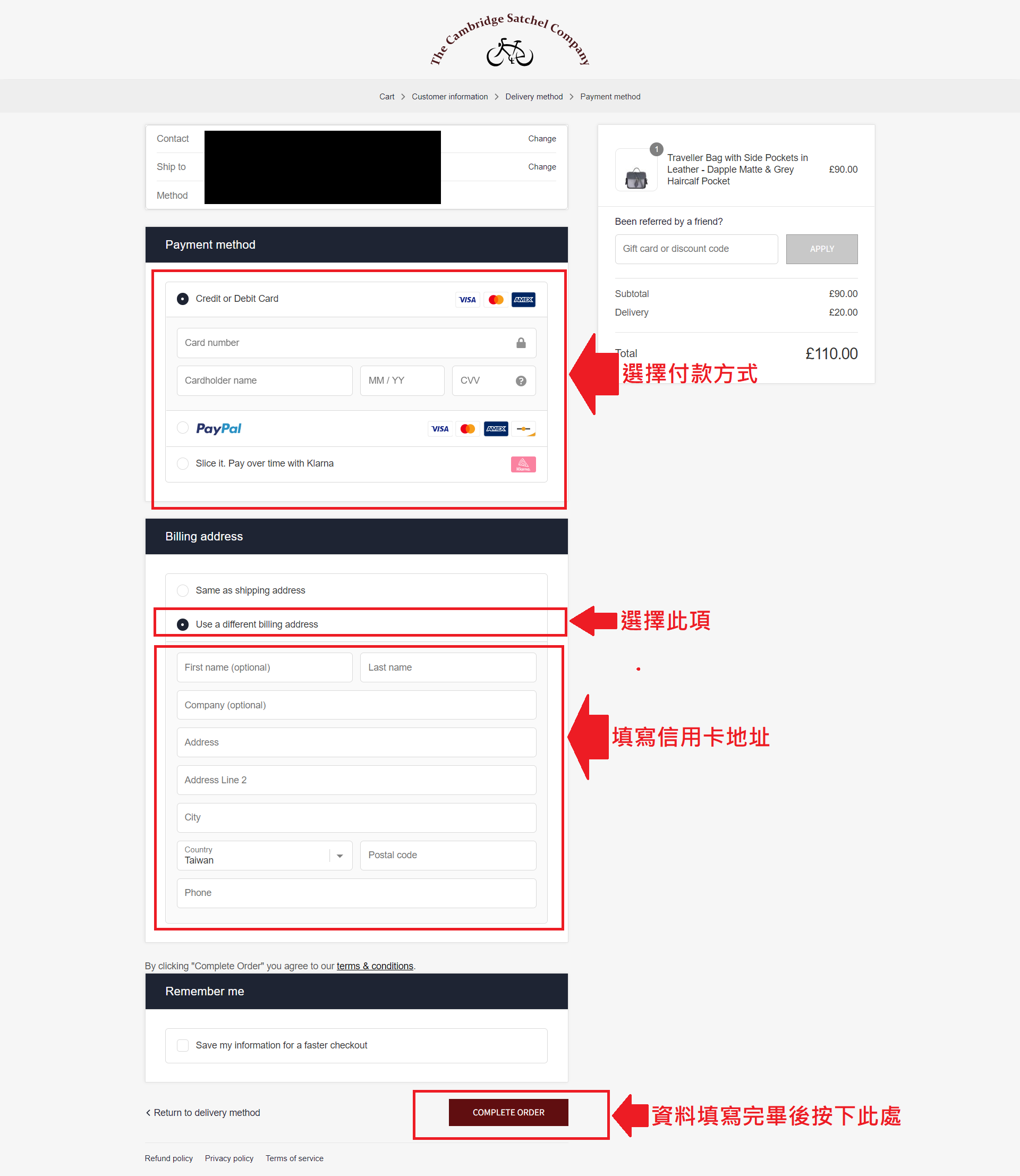 STEP 7.接著便會進入付款頁面(如下圖),共有三種付款方式,勾選後填寫資料按下「Complete order」便可付款。