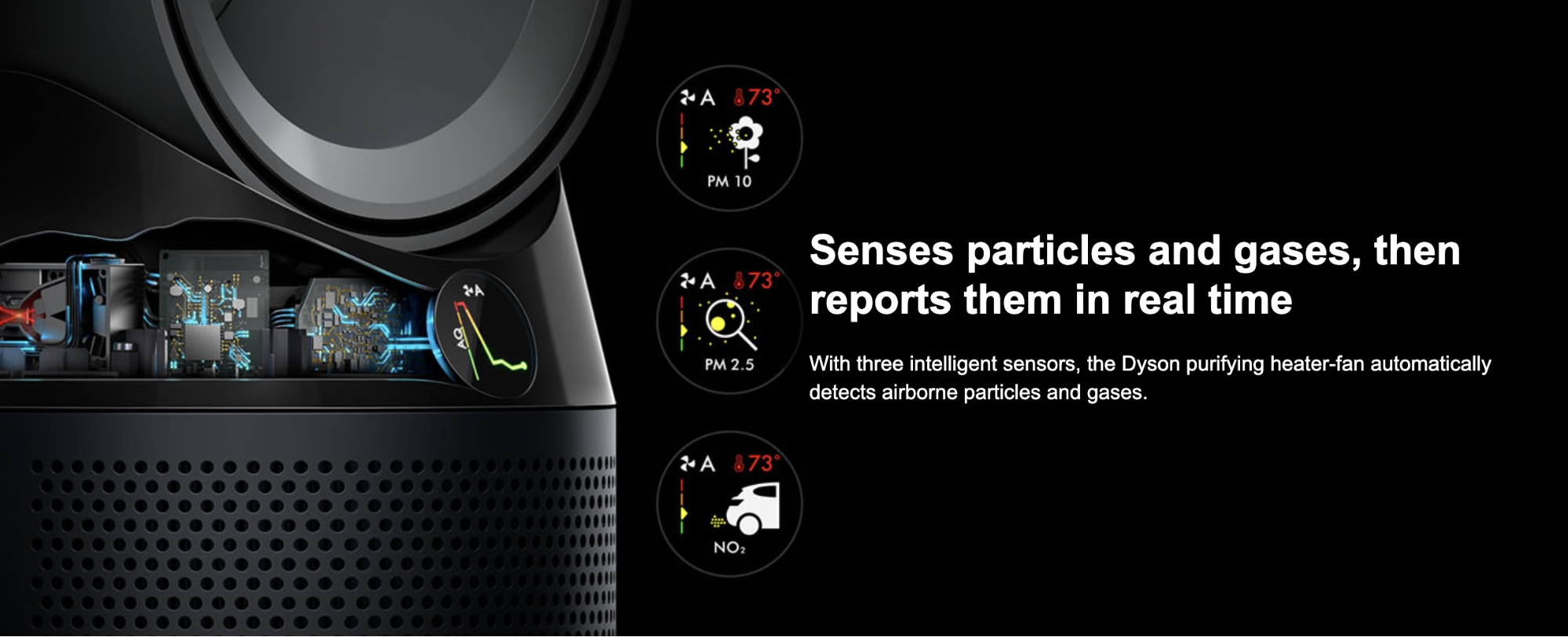 智慧監控功能,自動偵測懸浮粒子與氣體,並即時分析及回報在手機APP Dyson Link上,輕鬆從手機看到戶外、家中的空氣品質和溫度、濕度及濾芯壽命,還可以進行遠端操控。