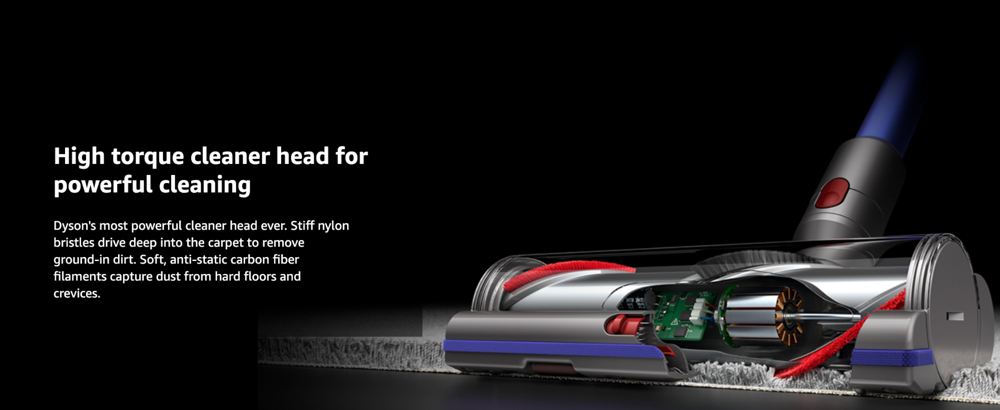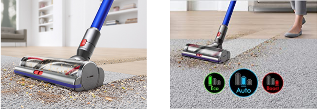全新高矩吸頭給你最強勁的清潔力,無論是刷毛地毯或是普通硬地板,防靜電碳纖維材質幫你把灰塵全都清乾淨,還可以根據地面材質自動調節吸力!