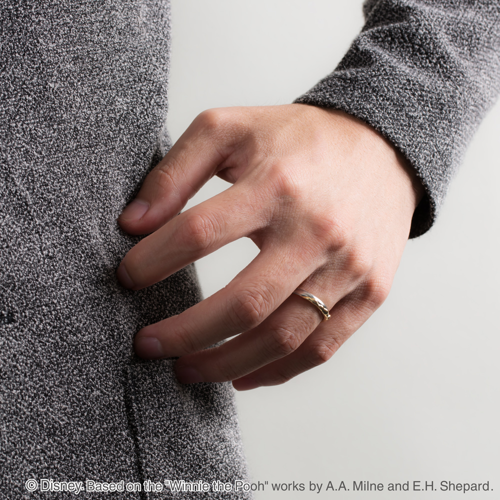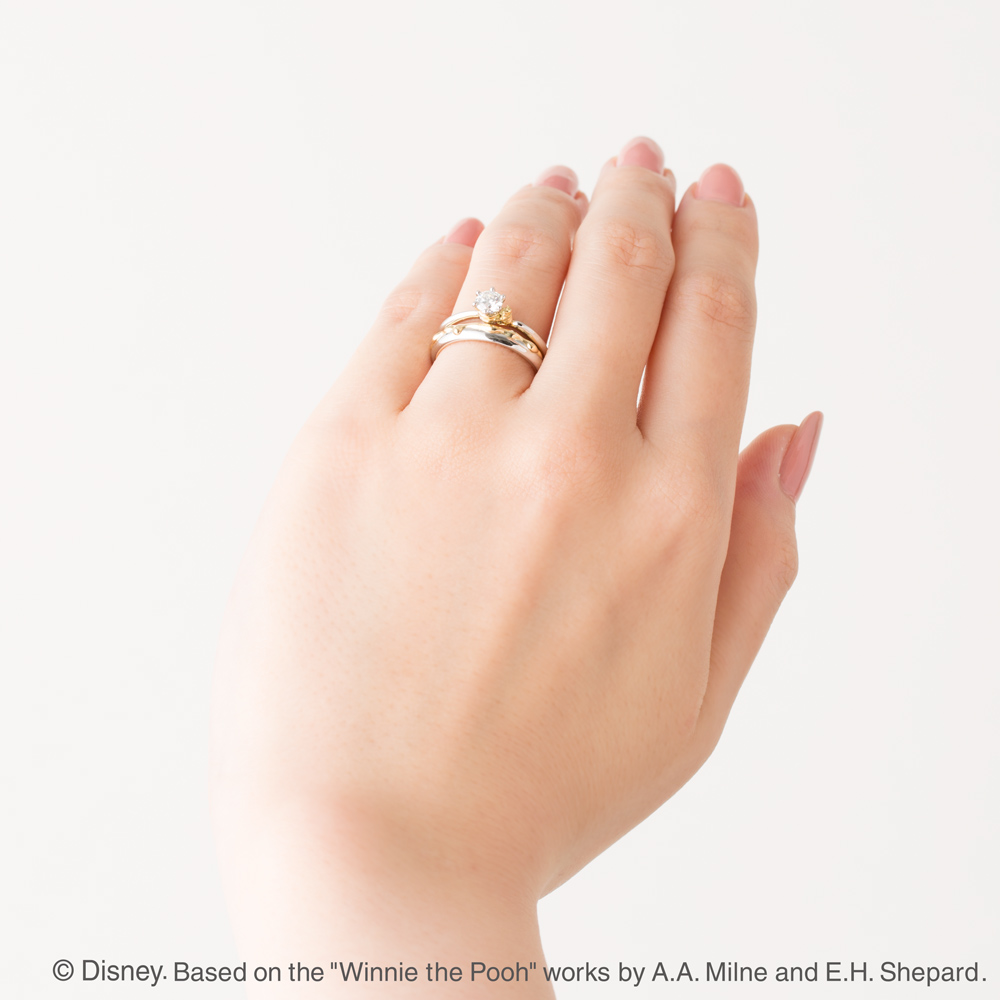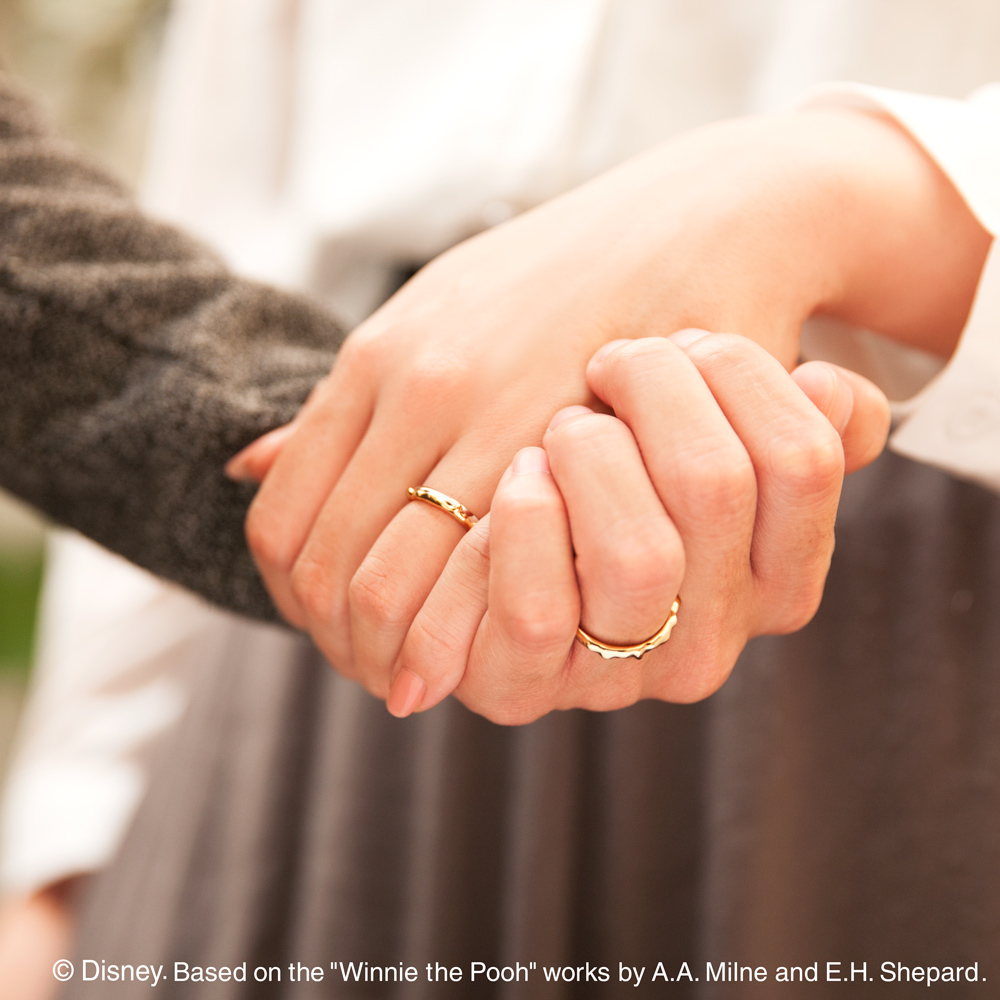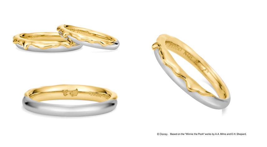 而這系列的結婚戒則是以沾滿蜂蜜的造型展現甜蜜,低調的造型卻同時擁有閃瞎眾人的暗示,內側還有維尼和豬仔的剪影,婚後是夫妻也要當彼此最好的朋友,另外更可以刻上你們的名字,低調的款式男生戴也不會奇怪,反而更多了特殊及造型感 !