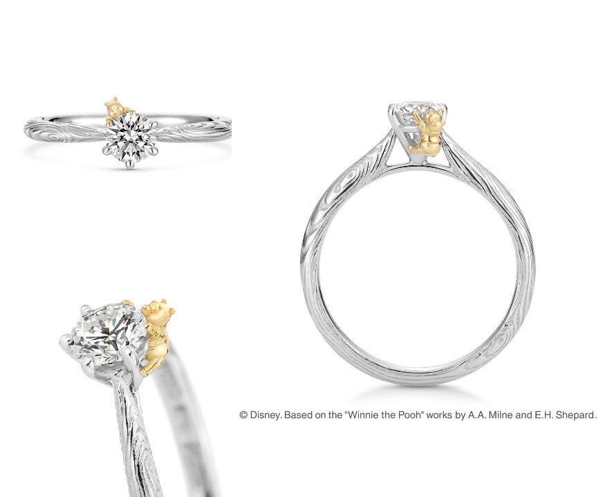 第一個系列是“ Very Merry Forest ”,這款訂婚戒是用維尼趴在鑽戒上為造型,緊緊抓住的身影就像你們一樣,一輩子永遠不會把對方給放開 ! 這系列款式正面是一枚簡單的鑽戒,側面來看卻有可愛的小熊維尼造型,戒指環刻有木紋,正式中帶著可愛,婚姻就是要這樣充滿趣味呀~