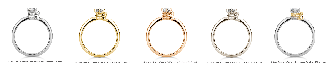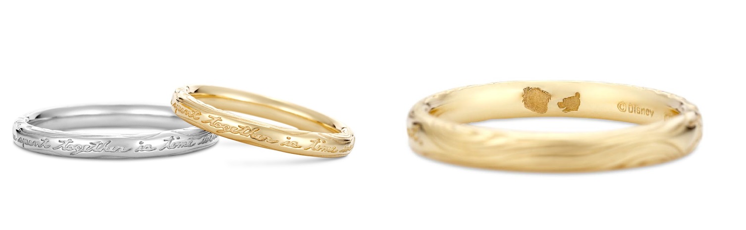 另外這個系列的結婚戒款則是比較低調,婚戒外側刻著「Time spent together is time well spent」,意思是「一起度過的時間就是好時光」,戒內則是刻上了維尼與克里斯多弗羅賓的剪影,強調兩人在一起的特別與美好。