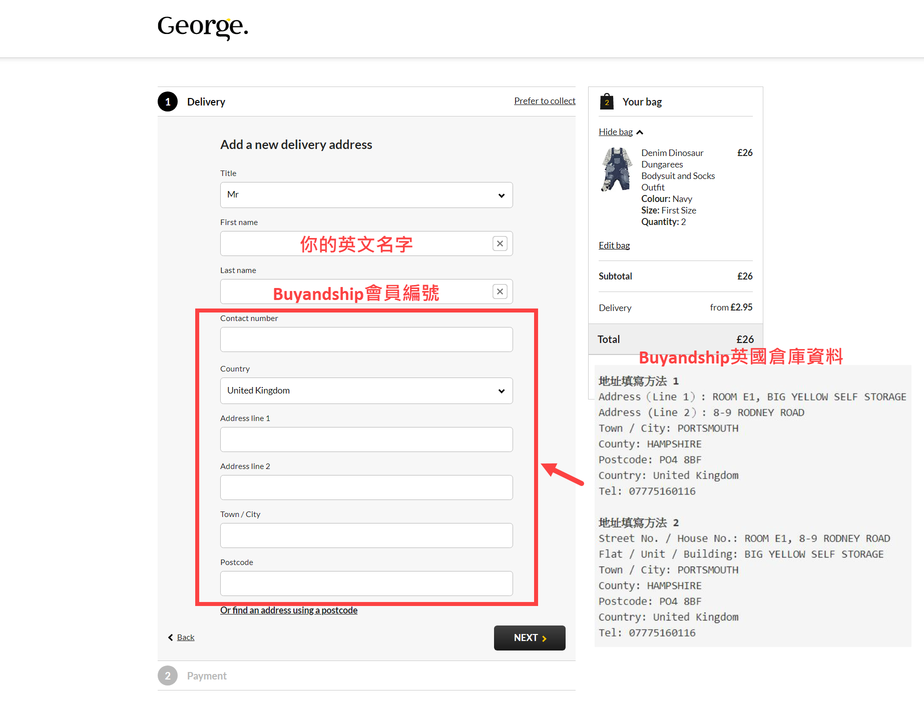 Step6. 輸入Buyandship英國倉庫收貨地址詳細資料,按照Buyandship網站給的資料填寫空格