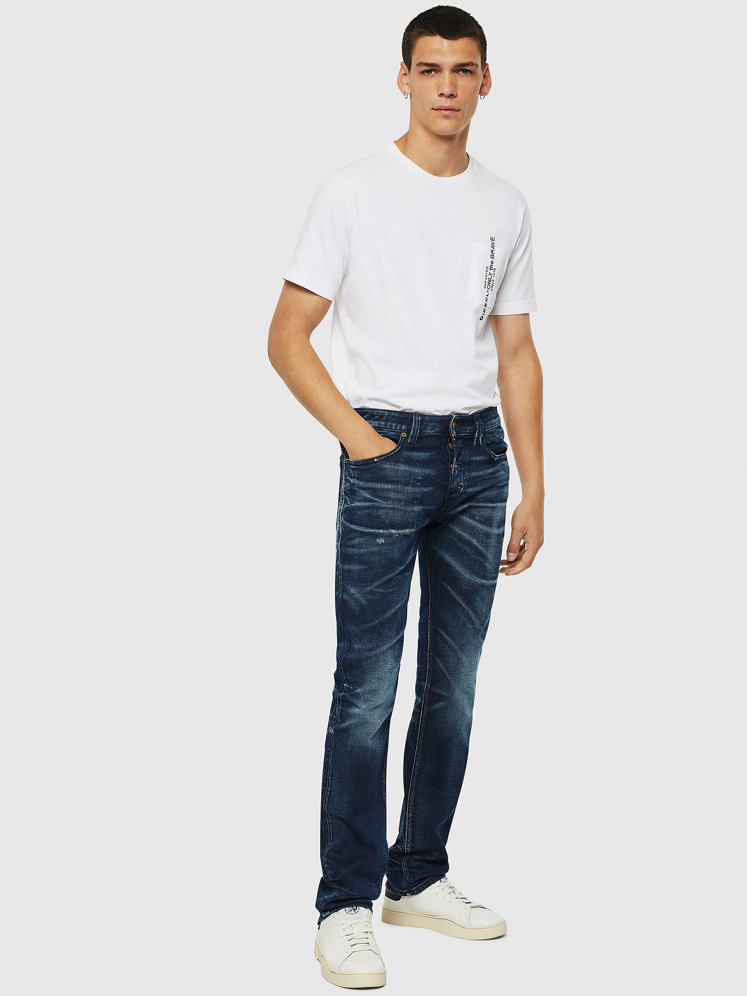 Diesel 經典牛仔褲 Tepphar 0890X 修身牛仔褲,穿上後腰部舒適,腿從膝蓋到腳踝變窄。用深藍色水洗彈力牛仔布製成,褲子上有撕裂和修復的補丁痕跡,讓整體感覺潮度翻倍。
