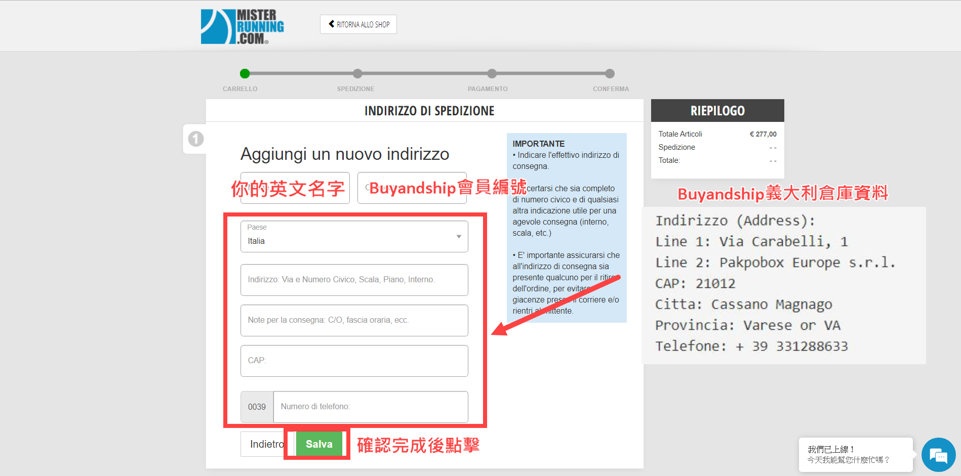 Step4. 輸入Buyandship義大利倉庫收貨地址詳細資料,按照Buyandship網站給的資料填寫空格