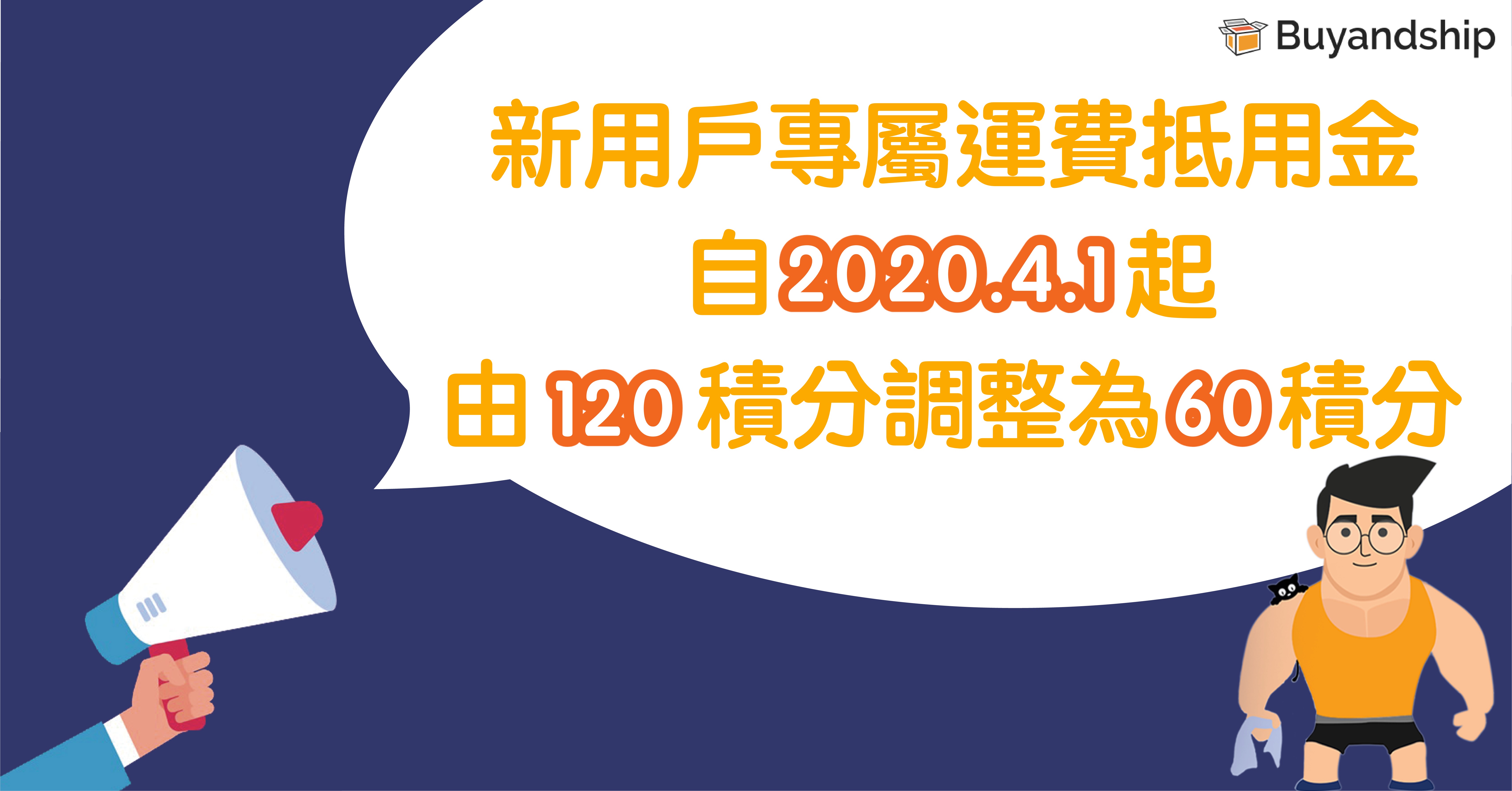 因新冠肺炎持續延燒,Buyandship已盡全力承受暴增的營運成本,無奈全球物流業仍受到劇烈影響,因此自2020/4/1起,新會員獎勵將調整至 NT60 運費抵用金。