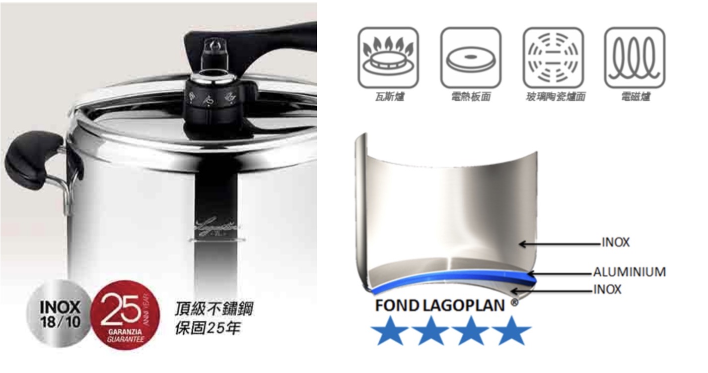 Lagostina樂鍋史蒂娜 Novia Vitamin系列壓力鍋,經典升級!2段式壓力設定,短時間即可將美味佳餚烹調完成,輕鬆上菜。特殊蔬果+魚肉兩段式氣閥,可依據料理食材種類調節鍋內壓力,烹煮時會發出”唧唧聲”隨時提醒料理正在烹調,不擔心遺忘。鍋體以18%鉻與10%鎳製成的不鏽鋼,無塗層、耐酸鹼抗腐蝕,不僅安全且更耐用,以不鏽鋼/鋁合金/不鏽鋼高熱壓鑄的複合式三層底部,無縫隙、不卡垢、不進水。完美導熱設計,均勻傳遞從鍋底到達鍋身,儲熱效能優良,有效提升烹煮效能。適用於一般家用爐具:瓦斯爐、電爐、陶瓷爐、黑晶爐、電磁爐等各種爐具(快速爐除外)。