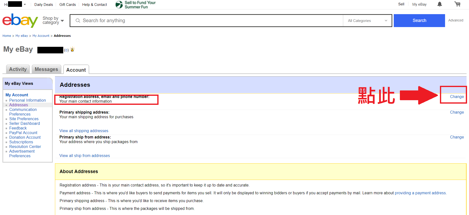 Step5.找到左方欄位中My Account下的Addresses選項,點入後找到第一個Registration address.email and phone number,然後點選右邊的 Edit (如下圖)。