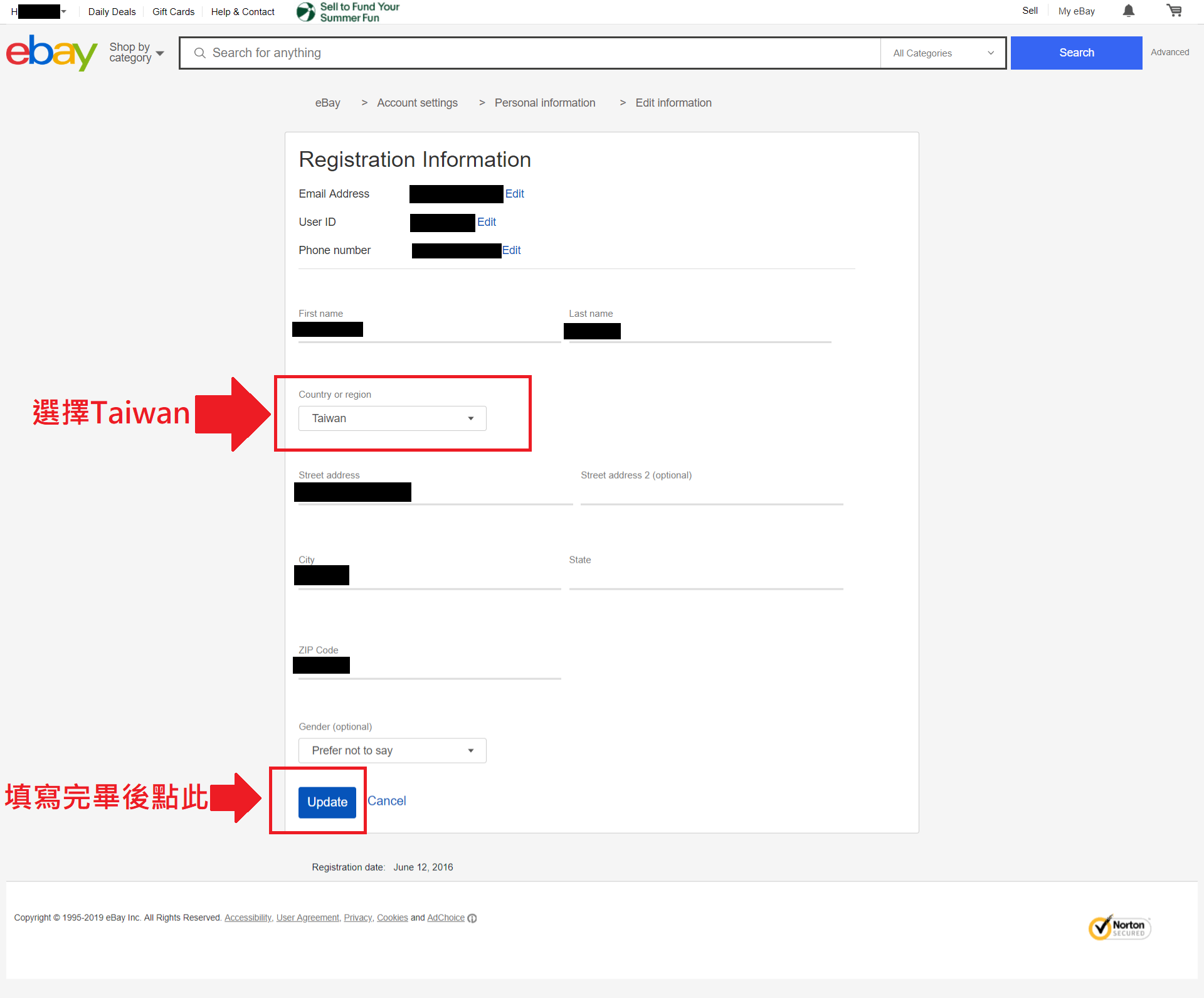 Step7.接著填寫你的資料,並將 Country and region 設定為Taiwan,都填寫完畢後按下Update。