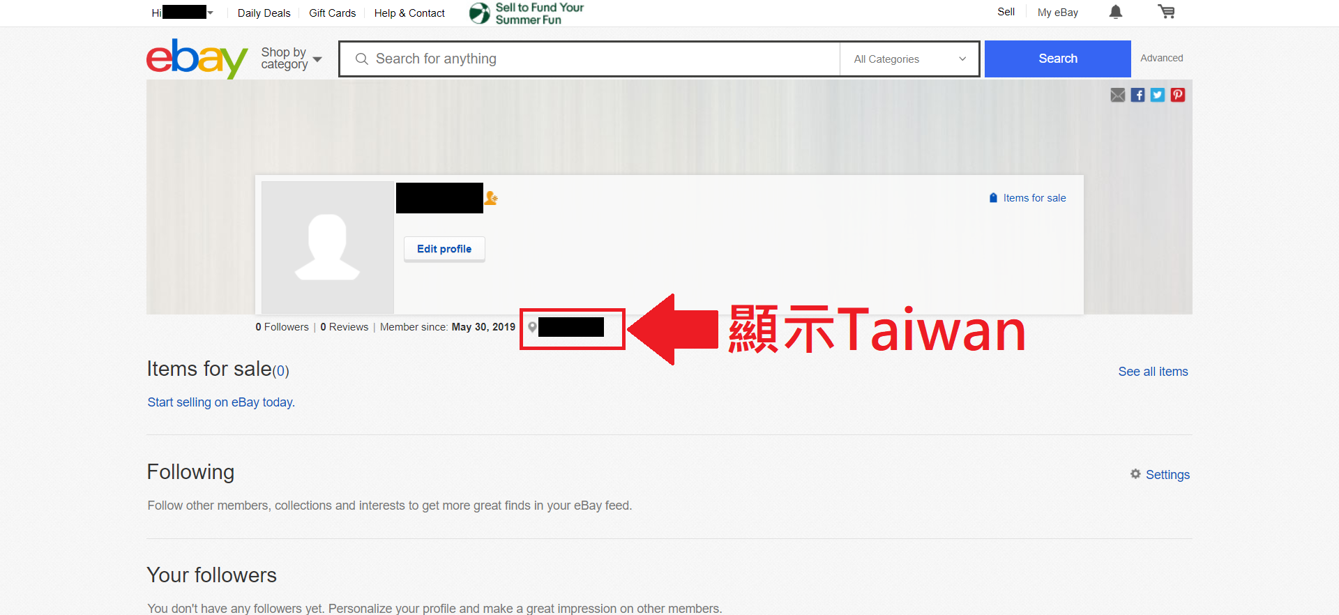 如果您本身已經有ebay 帳號,請勿更改您的地區,因為有可能會使 ebay 系統引發網路安全考量,而導致帳號被停權。請重新註冊一個「地區選擇台灣」的ebay會員帳號,並請勿與其它 ebay 帳號共同使用email 。