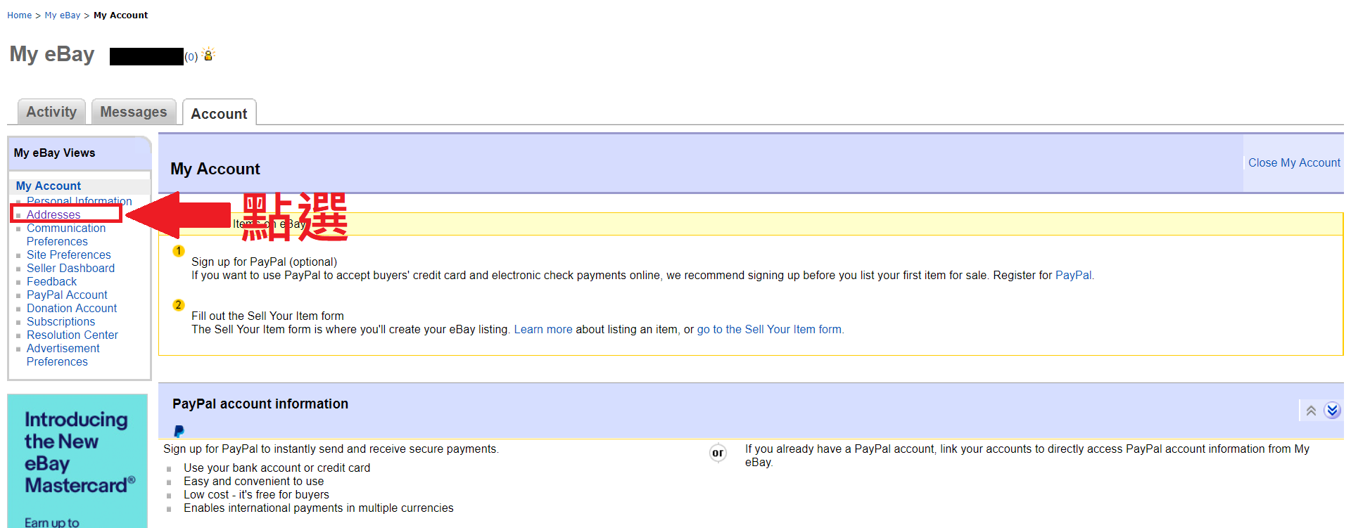 Step3. 由於運費優惠活動只限台灣地區ebay用戶參加,因此在註冊後請將登記地區選擇台灣。登入後將游標移至左上角,並點入Account settings(如下圖)。