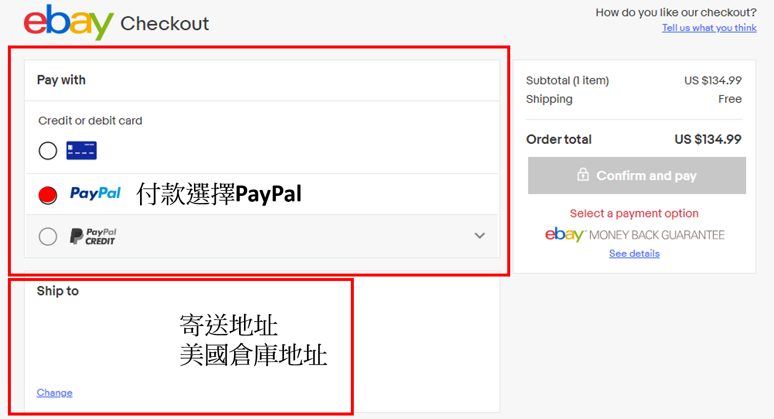Step11. 到購物車中確認商品,進行PayPal付款、選擇寄件地址(美國倉庫地址)。
