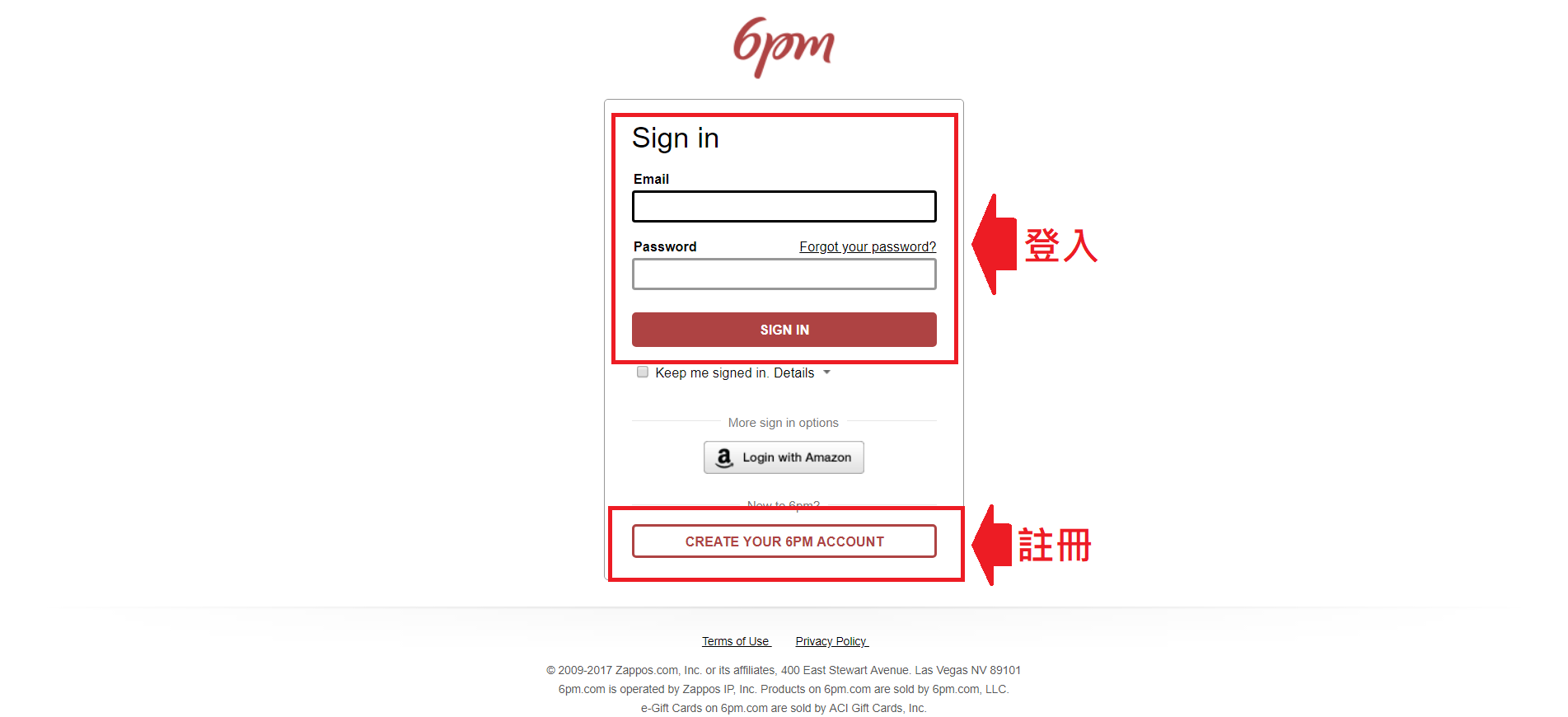 STEP 2.進入6pm官網,接著游標移到右上方的人像點選「Log in or Register」(如下圖)