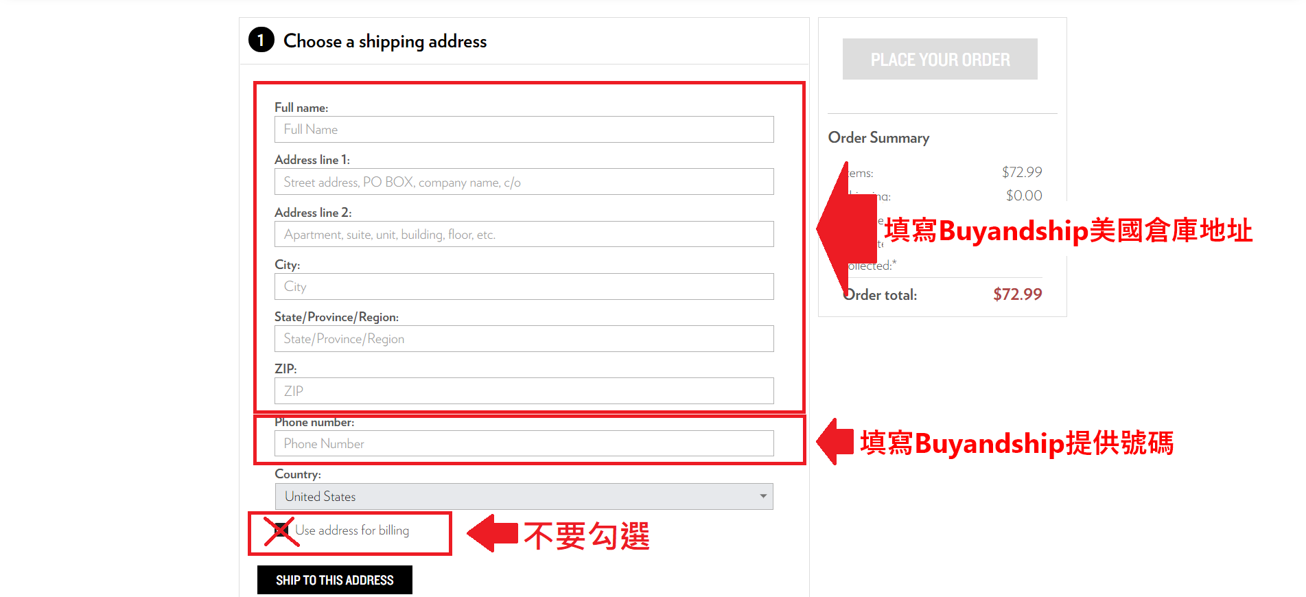 STEP 6.按照Buyandship網站中給的資料填寫空格(如下圖),然後按下SHIP TO THIS ADDRESS(記得名字要用羅馬拼音且依照Buyandship提供的模式填寫)