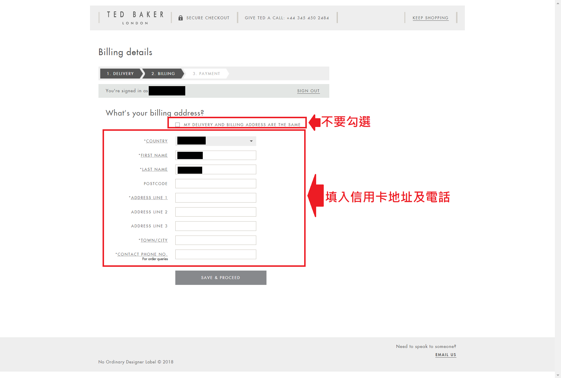 STEP 7.接著便會進入帳單頁面(如下圖),按照以下提示進行填寫後按下SAVE & PROCEED