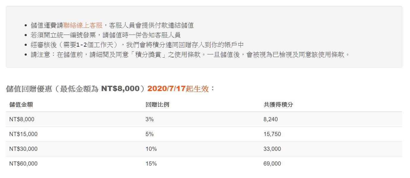 - 審核1-2天後,您的積分和回饋就會出現在帳戶中啦!儲值越多回饋積分越高喔~