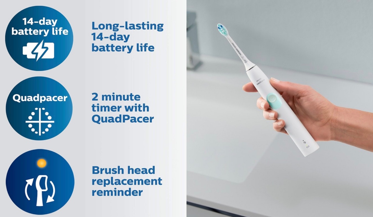 濃密高品質刷毛的牙菌斑清除效果比手動牙刷提高達 7 倍,特殊曲線外型的強韌刷頭可輕易深入口腔後方清潔牙齒。還有貼心壓力感知,如果在牙齦上施加過大的力道,牙刷會發出脈動聲,提醒您將力道放鬆。刷頭會隨著時間逐漸磨損,具備 BrushSync 技術能追蹤刷頭的使用時間,應該更換刷頭時,會透過握把上的指示燈並發出 1 聲短嗶聲提示。
