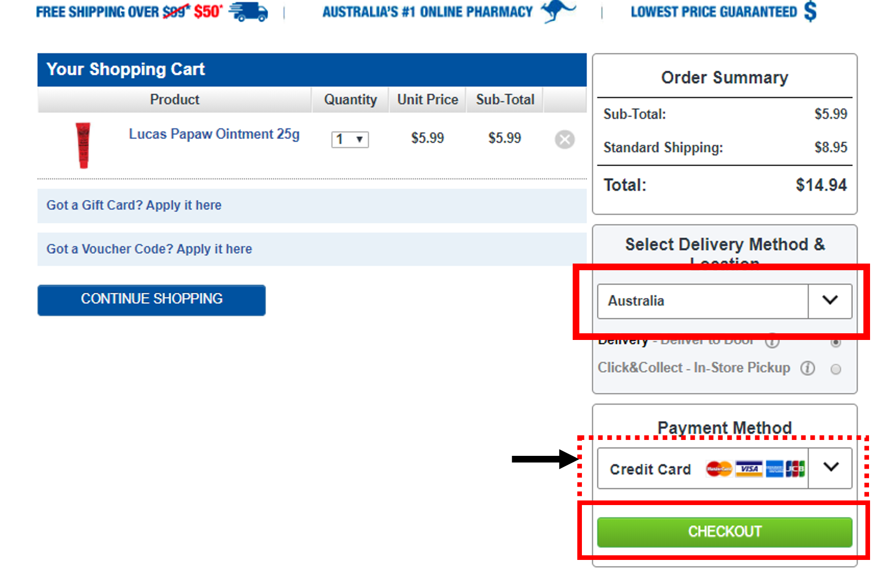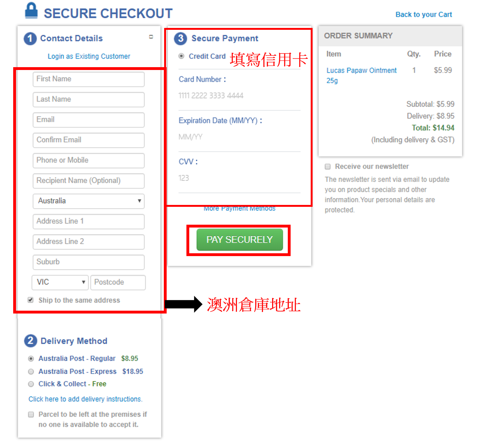 Step5. 確認送達國家點選「澳洲Australia」,再選擇付款信用卡(可先選擇Paypal付款,無法付款成功在試試用信用卡直接輸入),再點選「CHECKOUT 」進行結帳。
