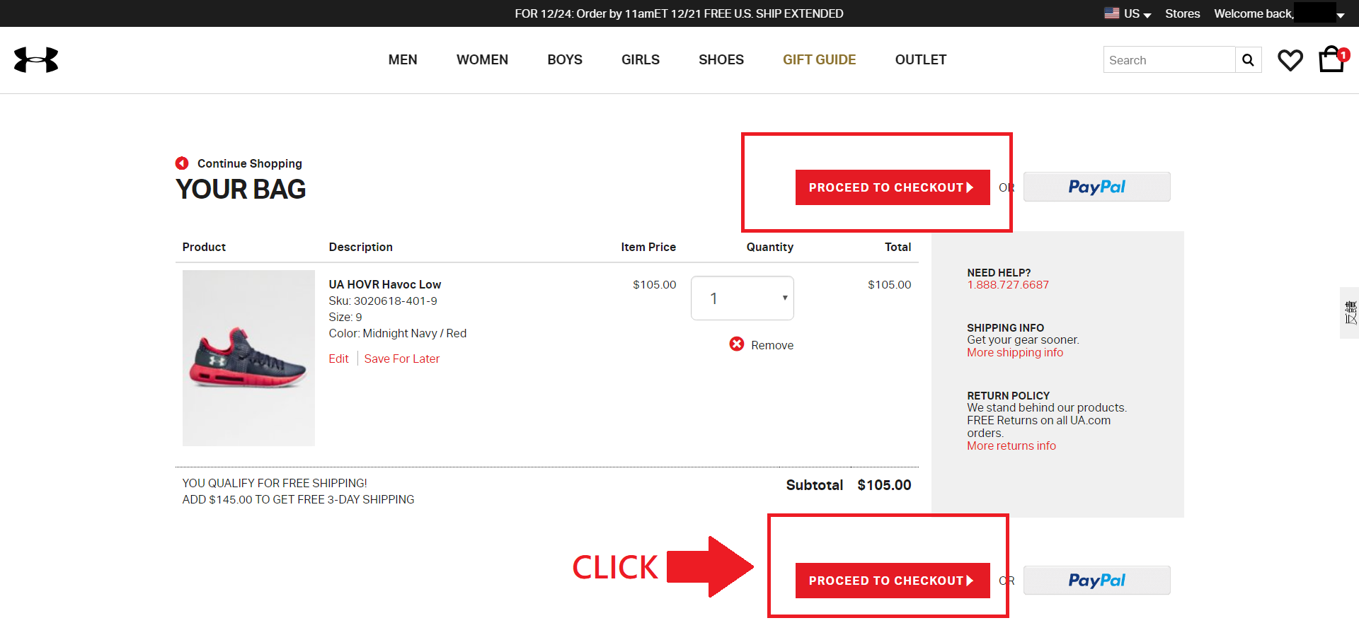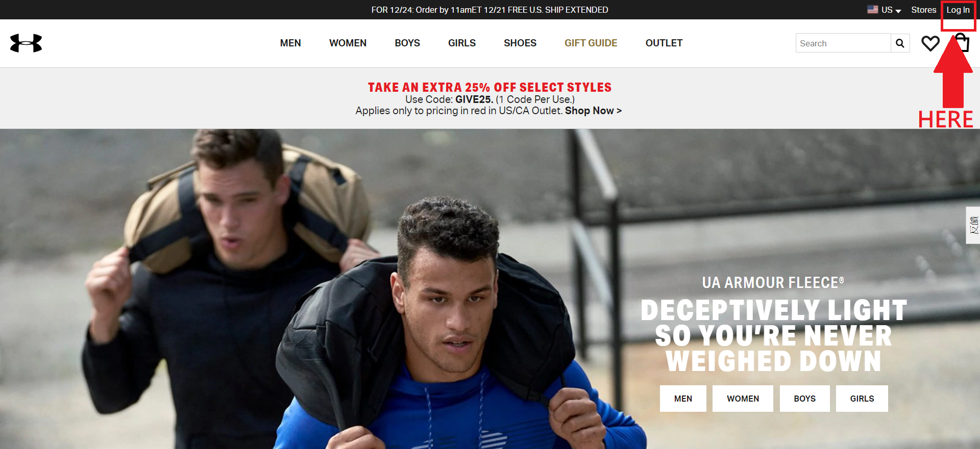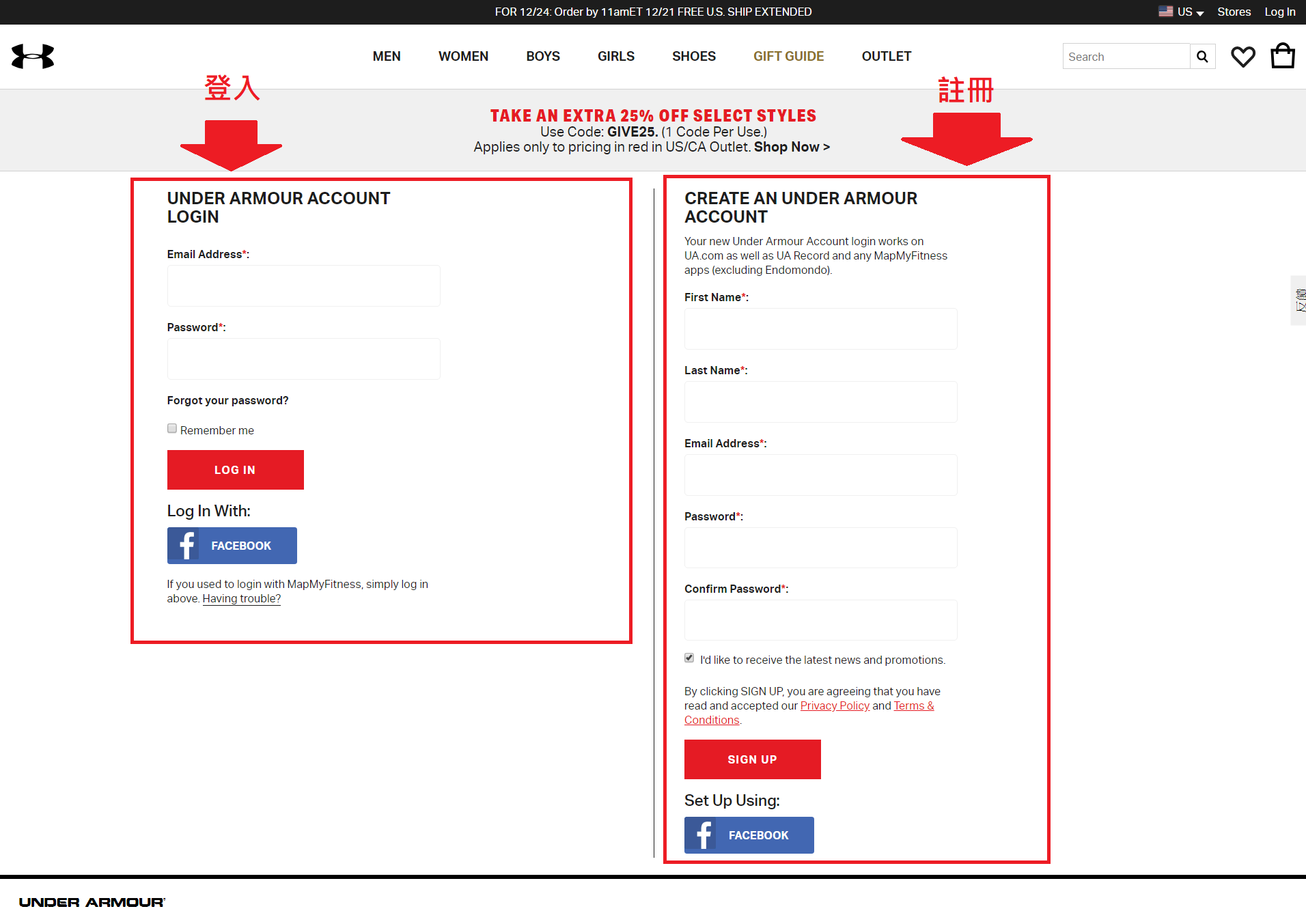 STEP 2.進入Under Armour官網,接著到右上方點選「LOG IN」(如下圖)