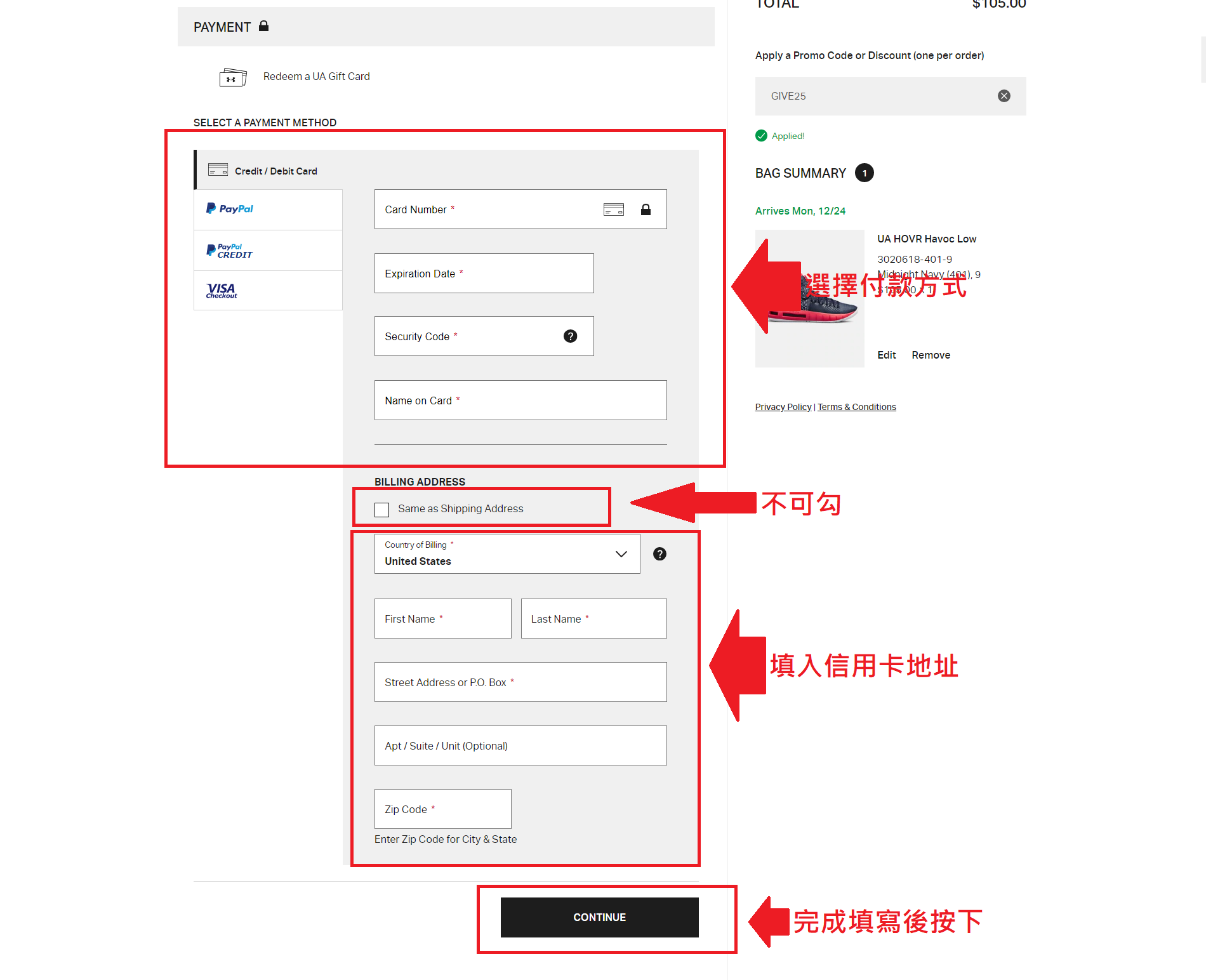 STEP 7.接著便會進入付款頁面(如下圖),共有四種付款方式,勾選後填寫資料按下「CONTINUE」便可付款。