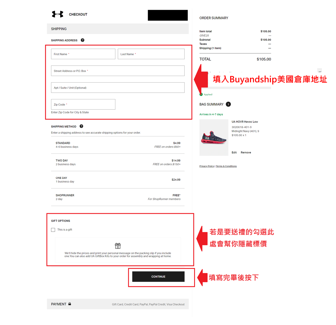 STEP 6.按照Buyandship網站中給的資料填寫空格(如下圖),然後按下CONTINUE(記得名字要用羅馬拼音且依照Buyandship提供的模式填寫)