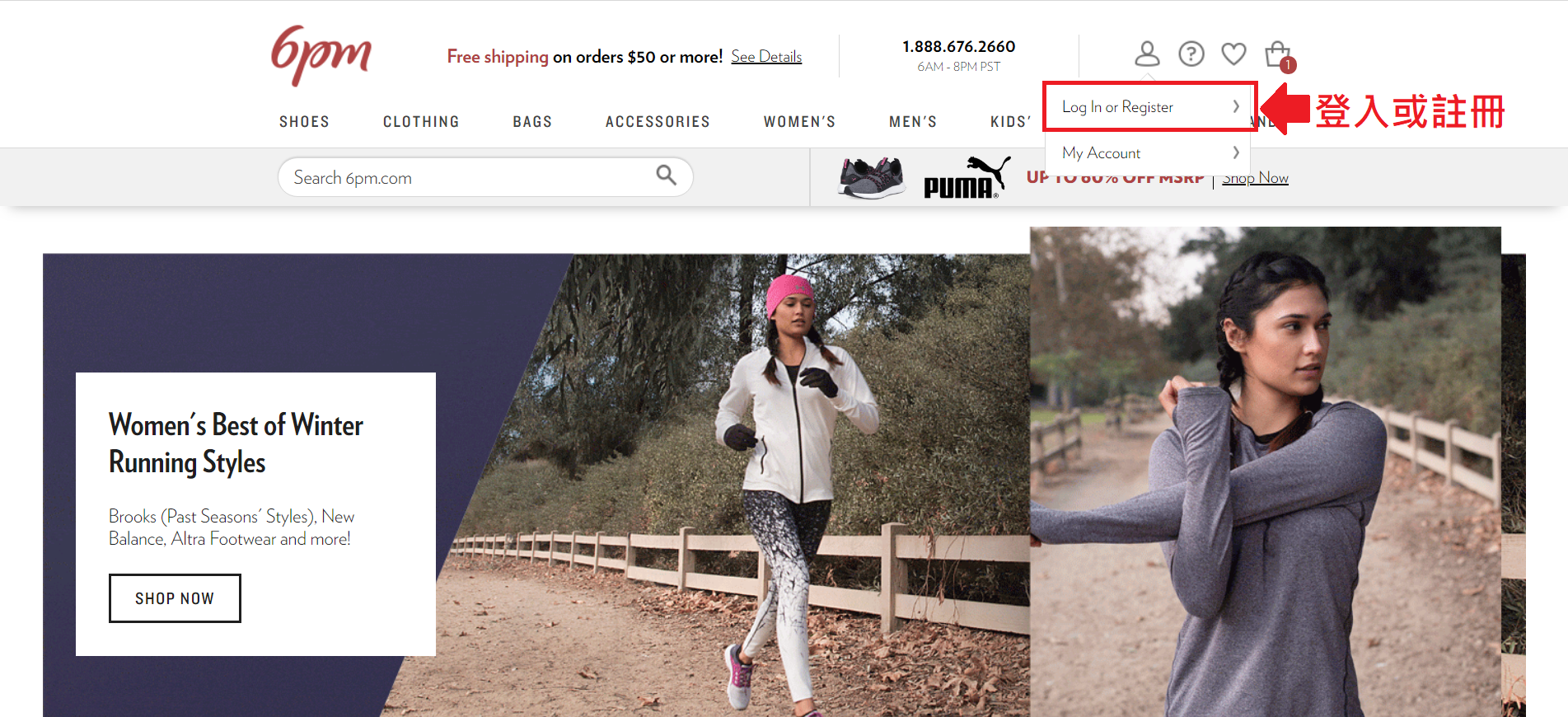 STEP 2.進入6pm官網,接著游標移到右上方的人像點選「Log in or Register」(如下圖)