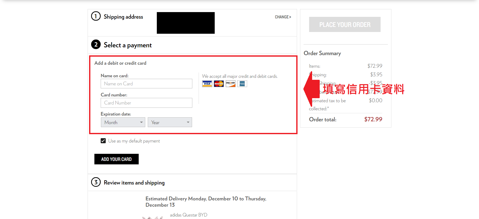 STEP 7.接著便會進入付款頁面(如下圖),填寫資料按下「ADD YOUR CARD」。