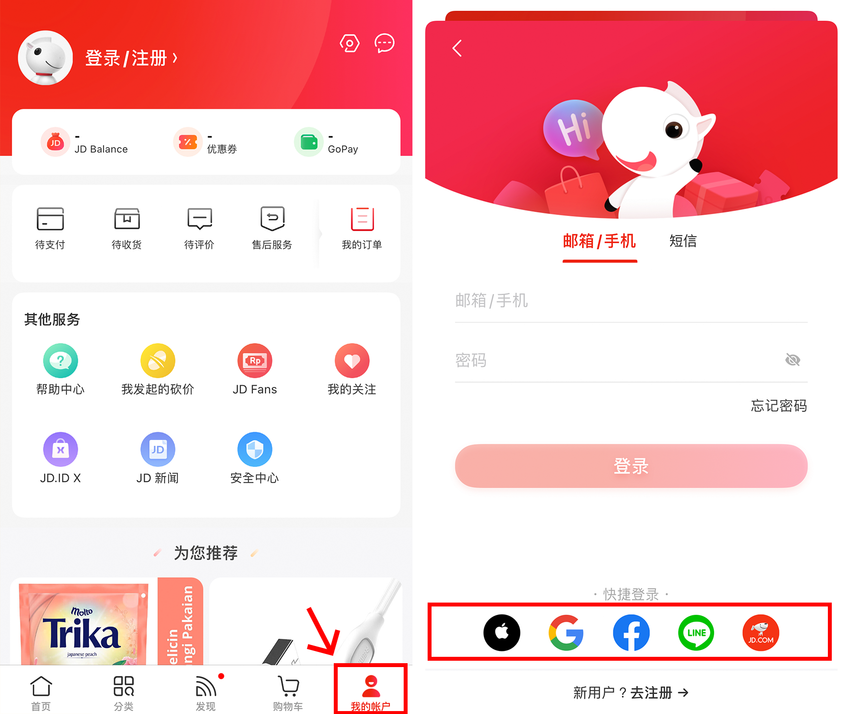 Step4. 點選「我的帳戶」再選擇「登錄/註冊」, 依照自己喜歡的方式登入或申請會員