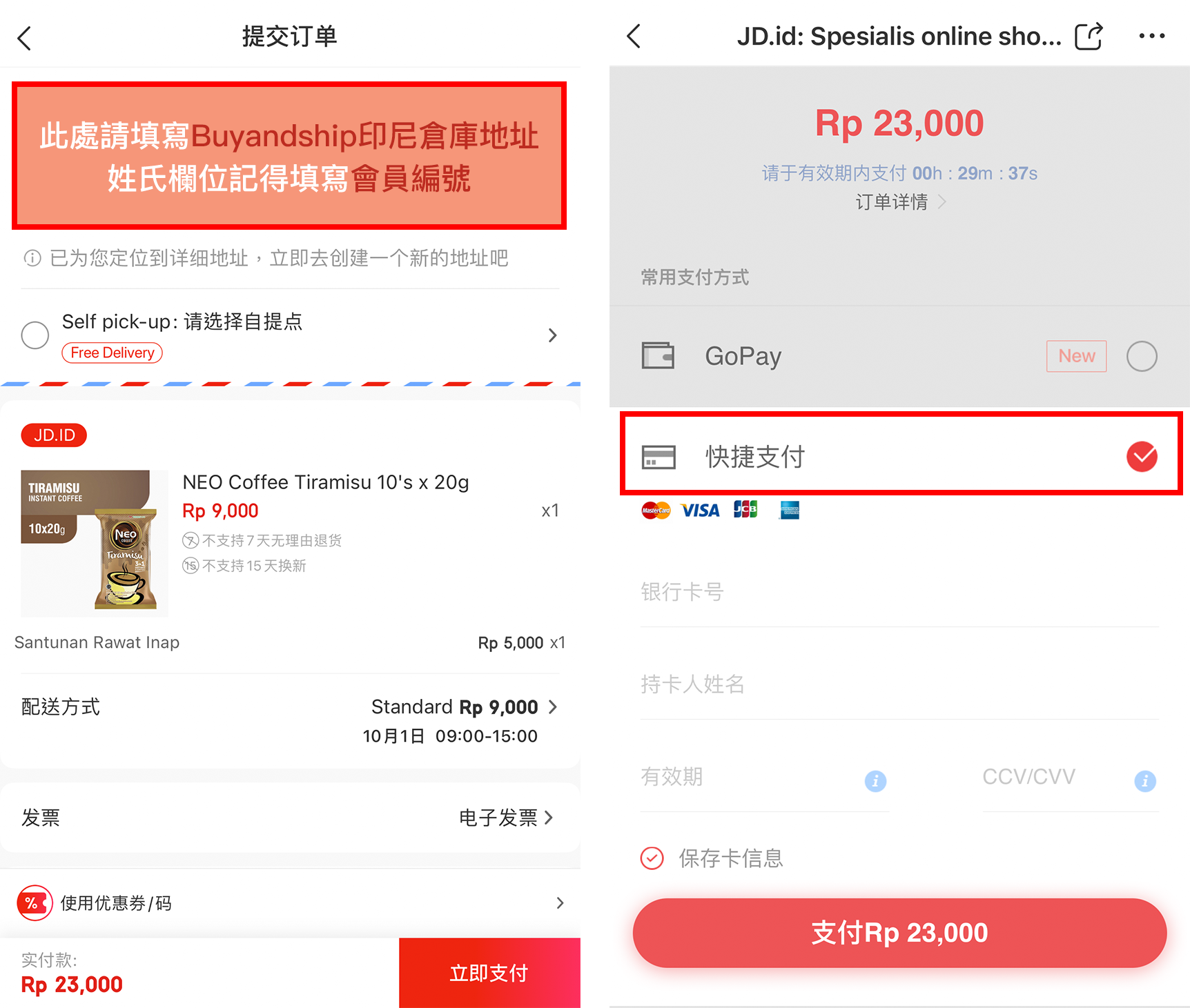 Step6. 確認購買金額、輸入收件資料,送貨地址請填Buyandship印尼倉庫地址,記得在姓氏欄位要填寫Buyandship會員編號喔!再選擇「快捷支付」使用信用卡付款!
