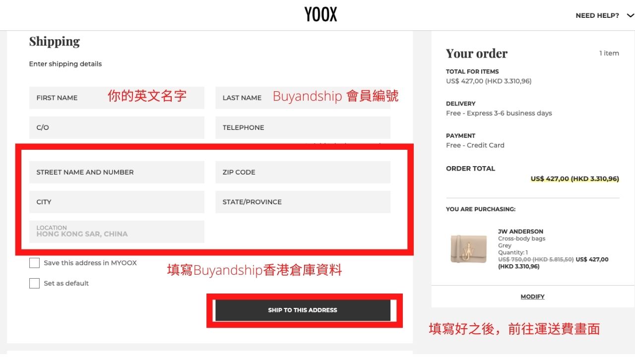 Step5. 輸入Buyandship海外倉庫收貨地址詳細資料,按照Buyandship網站給的資料填寫空格
