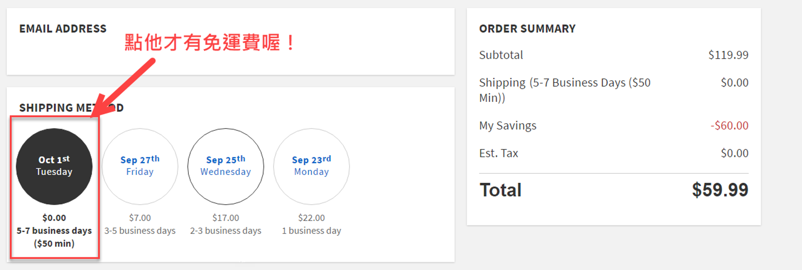 Step4. SHIPPING METHOD記得按第一個才有免運費喔!