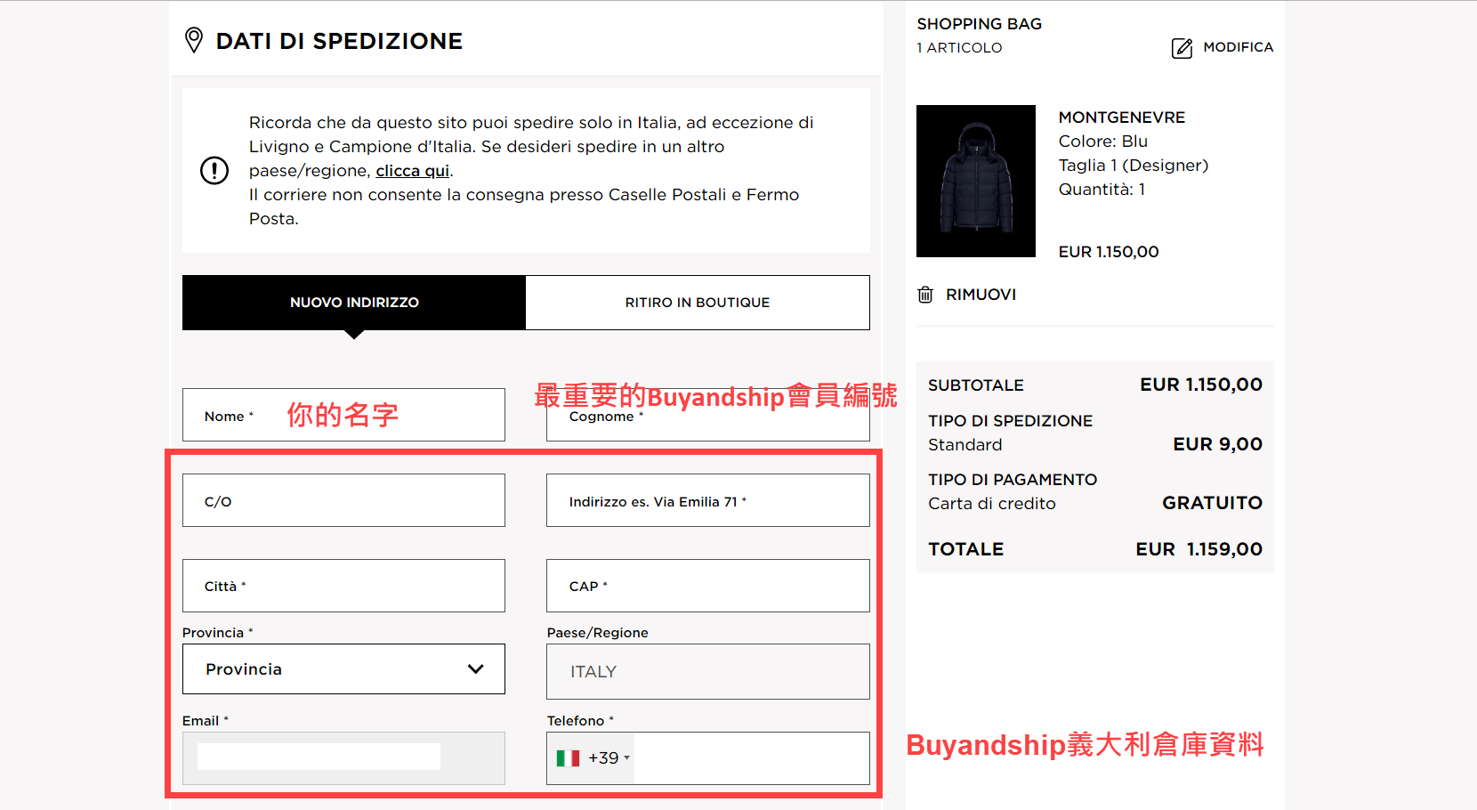 🔗義大利倉庫地址相關資訊,請到Buyandship會員中心的「海外倉庫地址」頁面去查詢