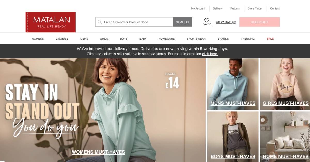 英國人全家大小都愛的國民品牌 MATALAN,從嬰幼兒到學齡的童裝都有,號稱品質最好、款式最多,童裝以「高品質+夠便宜+款式多」的CP值等級著稱,並且據說線上商店的商品比起紐約市中心門市要來得齊全喔!還有時尚的男裝、女裝和許多居家生活雜貨,應有盡有的商品從頭到腳都能在這裡找到,一站式購物讓你好方便!