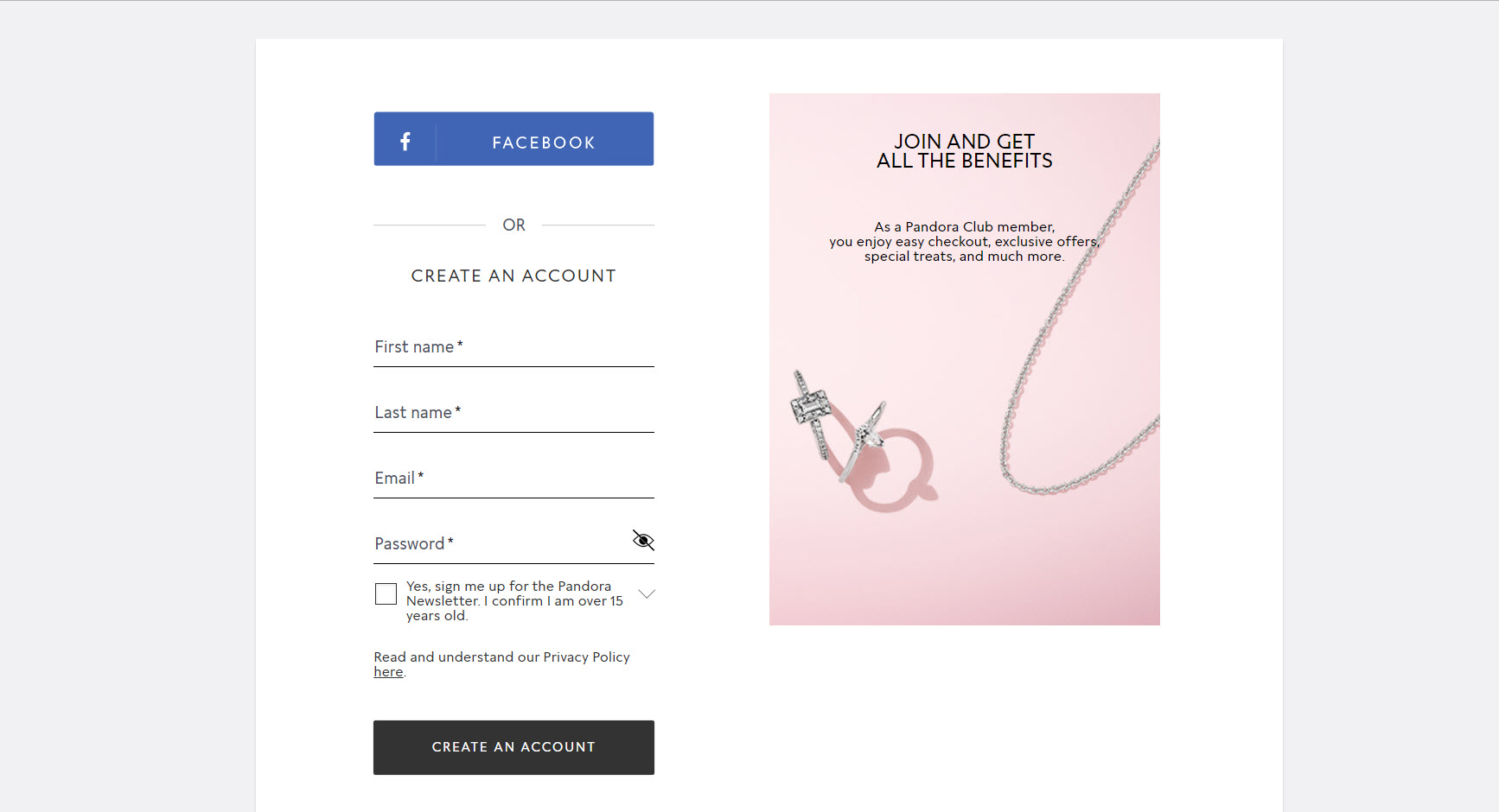 Step2. 進入英國Pandora官網,並且註冊/登入會員,也可以直接連結到Facebook呦~