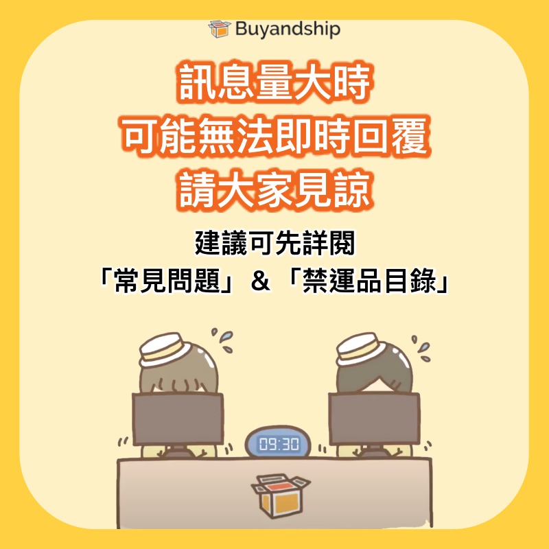 目前客戶服務僅提供線上服務,並提醒會員,請儘量使用官網右下方橘色框框處來做詢問,FB臉書訊息容易漏信喔!另外,Buyandship提貨點的現場工作人員,都不是客服人員,沒有查詢貨件狀態的權限,因此無法幫到現場的會員寶寶回答物流相關問題喔!