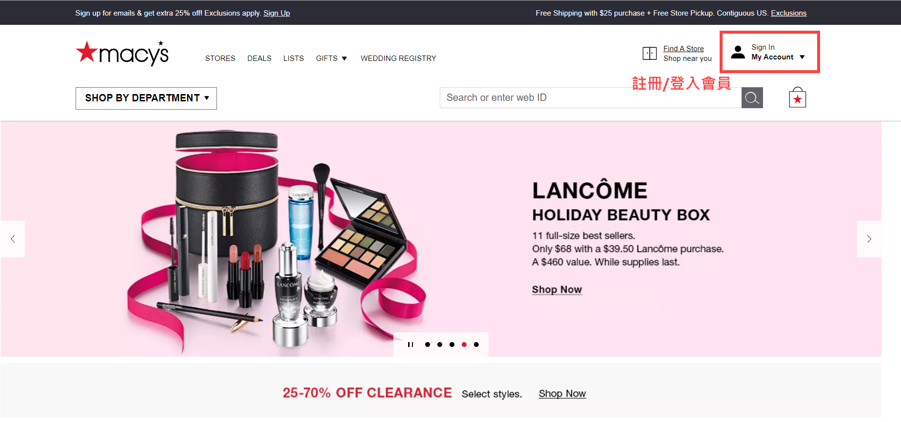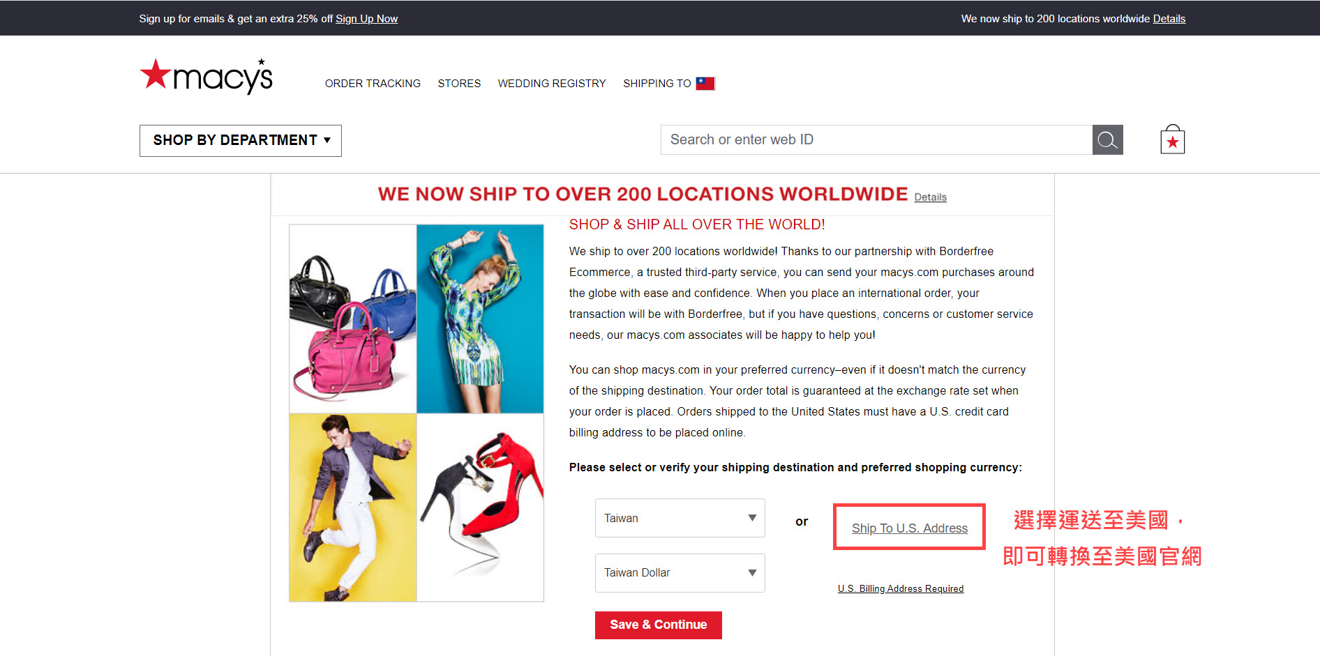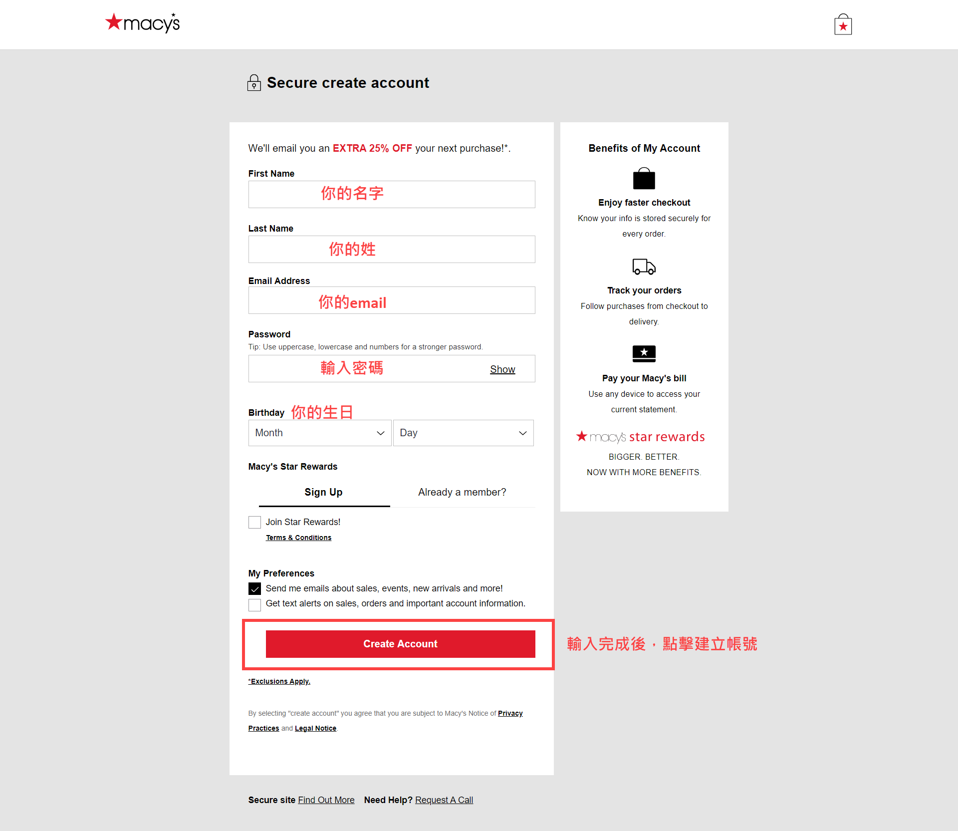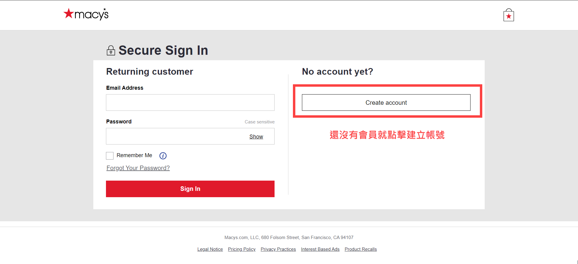 Step2. 到美國Macy’s官網,並且註冊/登入會員(可參照下圖申辦會員)。記得先切換到美國官網喔~
