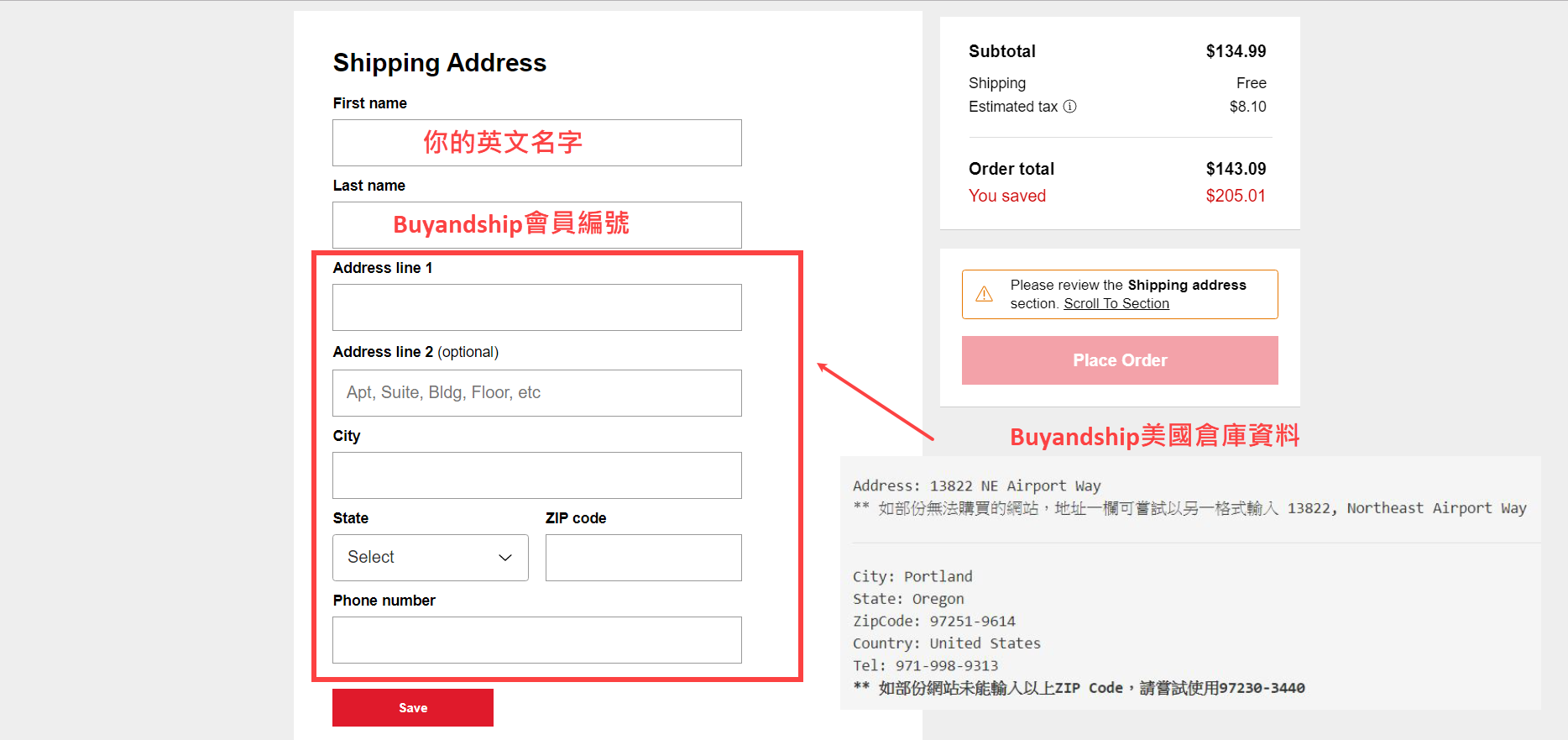 Step5. 輸入Buyandship美國倉庫收貨地址詳細資料,按照Buyandship網站給的資料填寫空格