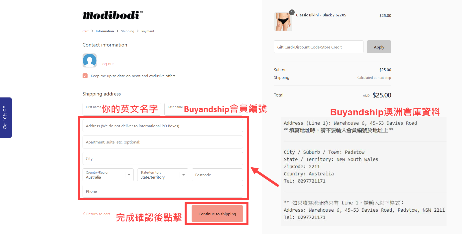 Step5. 輸入Buyandship澳洲倉庫收貨地址詳細資料,按照Buyandship網站給的資料填寫空格