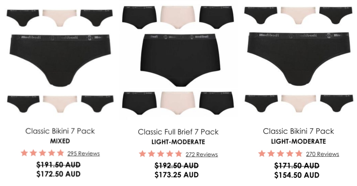 這款是最基本的款式,主要可以在流量沒那麼大的時候使用,讓你在生理期的一開始和最後也可以有最舒適的感受,不會再受悶熱的困擾了~單件購買的價錢為24.5澳幣(約台幣530元),雖然看起來不便宜,但是換算妳使用衛生棉的數量,是不是瞬間覺得很划算~而且又環保呢!如果想要一次多購買幾件,官網也有提供多件的組合,CLASSIC BIKINI的7件組只要154.5澳幣(約台幣3,300元),等於一件只要台幣470元,CP又更高了呀!其他款式也都有多件的組合可以選購呦!