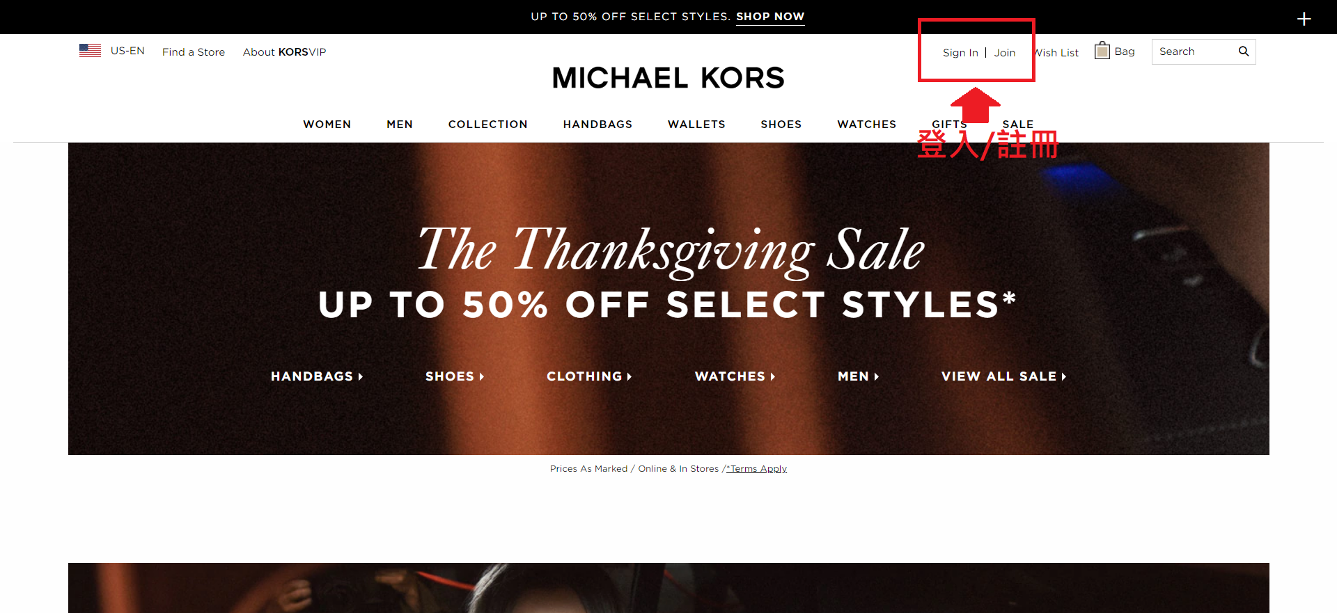 STEP 2.進入Michael Kors官網,接著點選右上方的「Sign In」或「Join」(如下圖),選擇後依序填入資料完成登入。