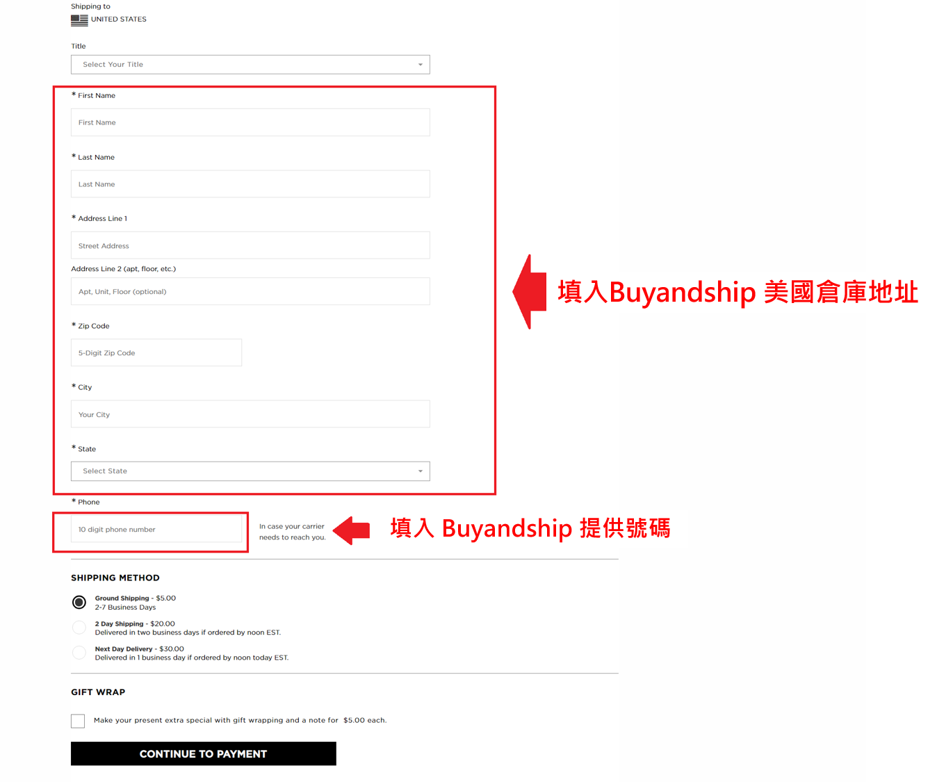 STEP 4.完成購物後,進入購物車確認自己購物清單,按照BNS網站中給的資料填寫空格(如下圖),然後按下最下方的CONTINUE TO PAYMENT(記得名字要用羅馬拼音且依照Buyandship提供的模式填寫)