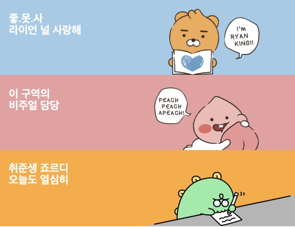 韓迷們一定知道KAKAO FRIENDS 是通訊軟體KAKAO TALK裡面的角色,比起LINE韓國人更愛使用KAKAO。 就像是LINE裡面的熊大、兔兔一樣,KF則是以浮誇又可愛的臉部表情及肢體動作擄獲廣大少女心,帶著一種微微呆滯的表情,每個角色都有自己的夢想,或是身分、個性,無論是想當明星,或是來自某島嶼的王子,都大大地活化了他們的可愛層次。