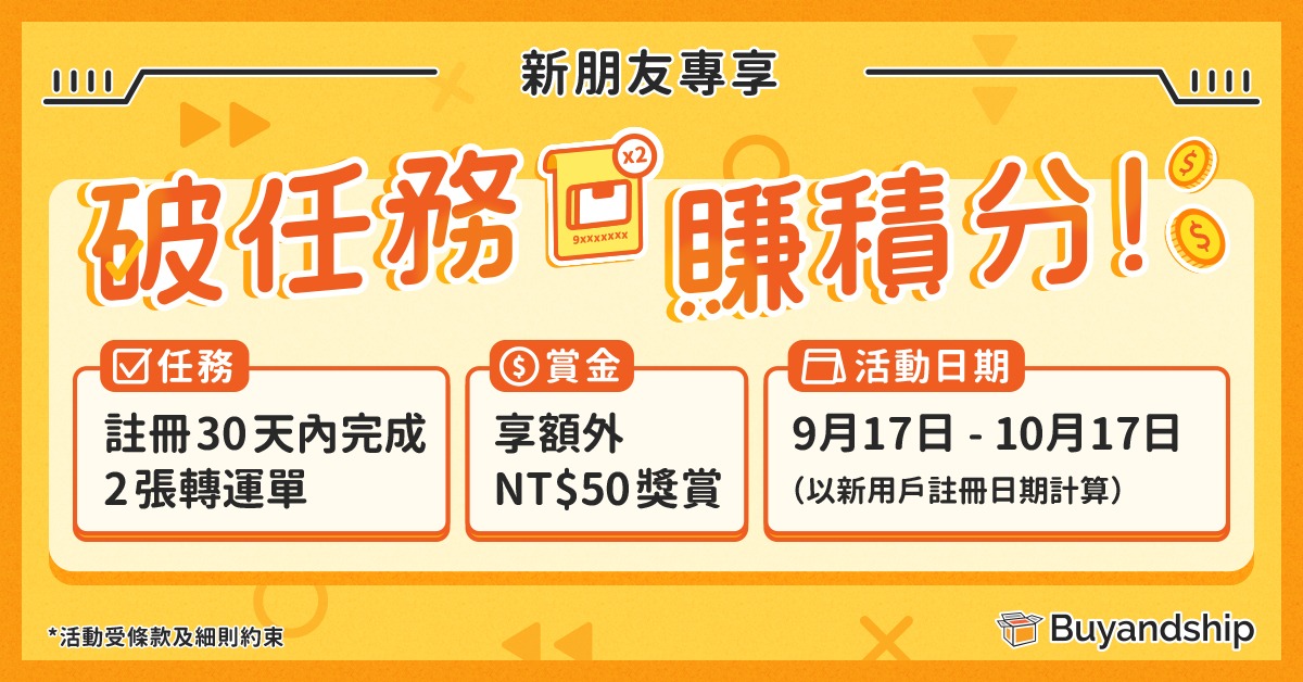 【新人好康1】註冊日起計30天內完成2張轉運單即可享額外50積分獎賞!歡迎加入Buyandship,打開世界購物大門!為了讓所有新朋友們更快的熟悉整個轉運訂單操作過程,在活動時間內完成註冊並於註冊日起計30天內完成2張轉運單的新會員,將格外獲贈50積分。(歡呼~~)