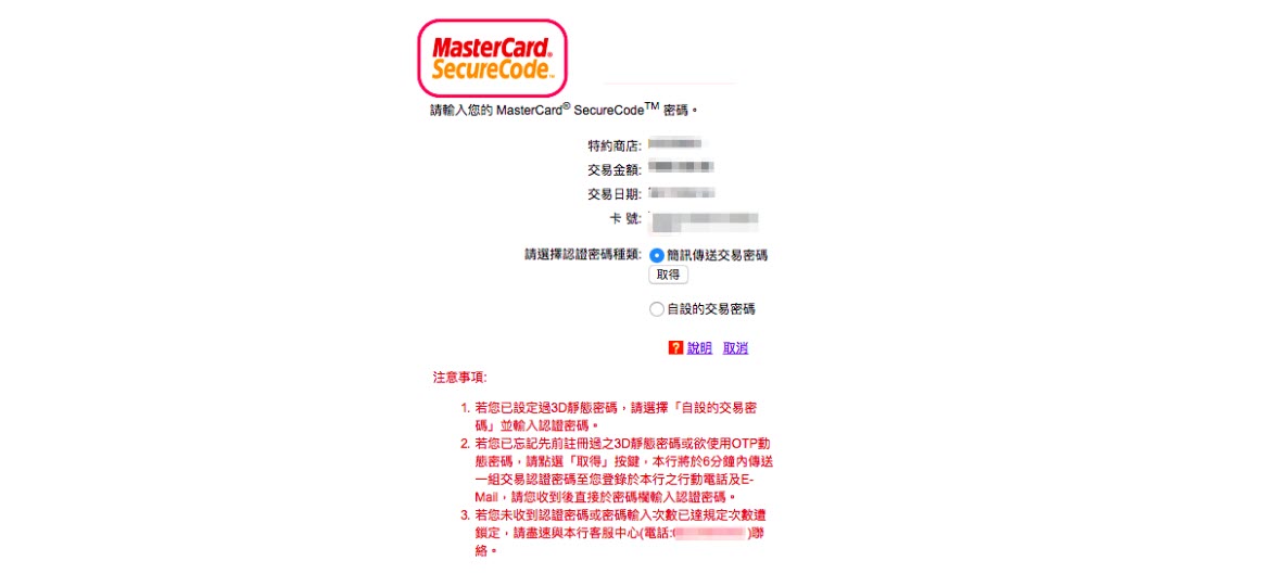 若選擇手機接收驗證碼,簡訊會寄到持卡人申辦信用卡時所填寫的手機號碼,僅部分發卡銀行(例如:台新、華南銀行)會同步發一封 email 到當初申請信用卡時登記的電子信箱,下圖為 MasterCard 之 3D 驗證畫面示意圖: