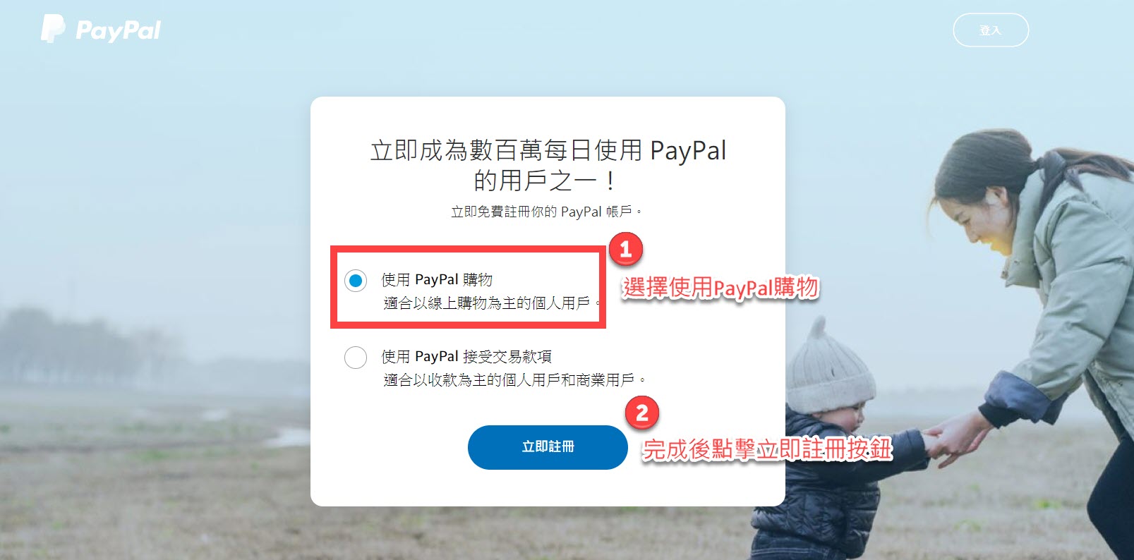 Step2. 選擇使用PayPal購物後,點擊立即註冊按鈕。