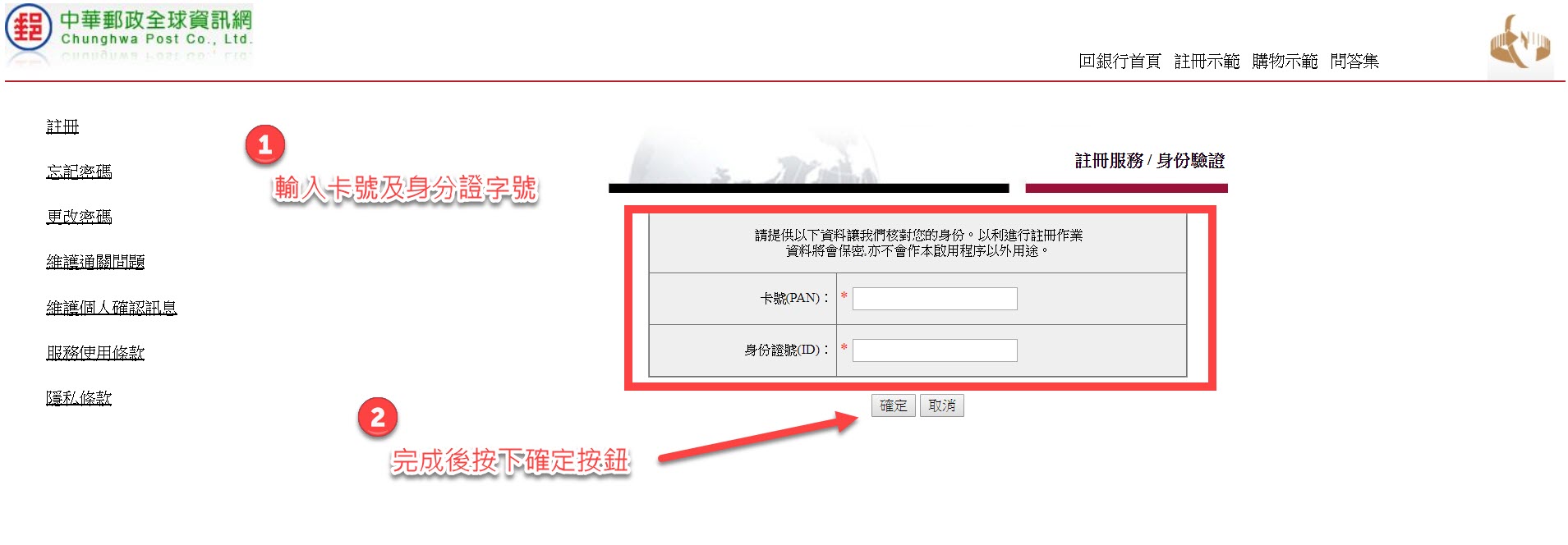 Step 2. 輸入你的卡號及身分證字號後,按下確定按鈕後,系統會邀在要求你輸入你的基本機料,如「手機收到的驗證碼」、「出生日期」、「卡片背面簽名欄的末三碼」以及「卡片有效期限」等,輸入完成後就完成了!