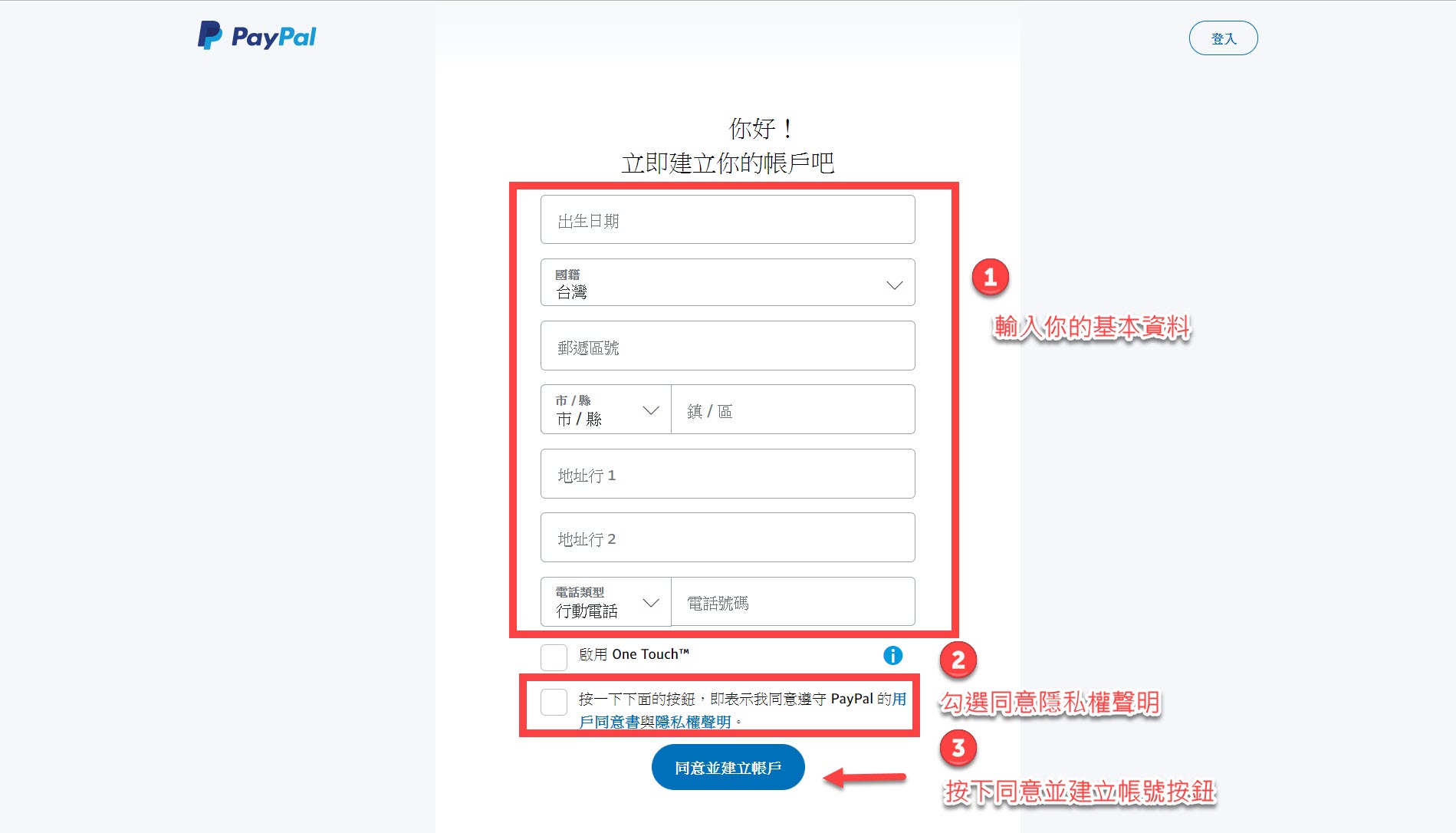 Step4. 輸入信用依照欄位輸入你的居住地址,勾選同意隱私權聲明,同意並建立帳戶。