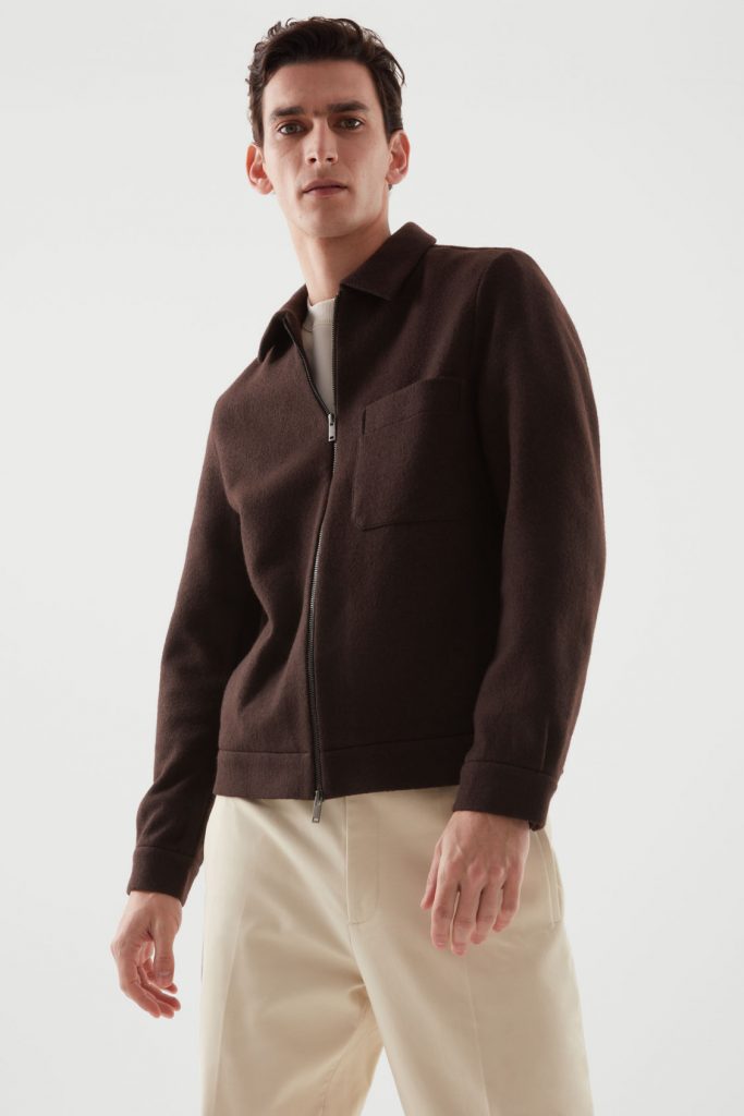這款 Harrington 夾克採用 65% 美利奴羊毛製成,用上雙頭拉鍊開合,胸前有一貼袋,合身版型,袖口位置有隱形按扣。