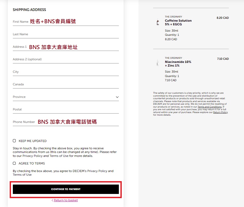Step 4:打開 Buyandship 網站的「海外倉庫地址」並選擇「加拿大」,然後複製 Buyandship 加拿大倉庫的資料,然後點擊「Continue to payment」。